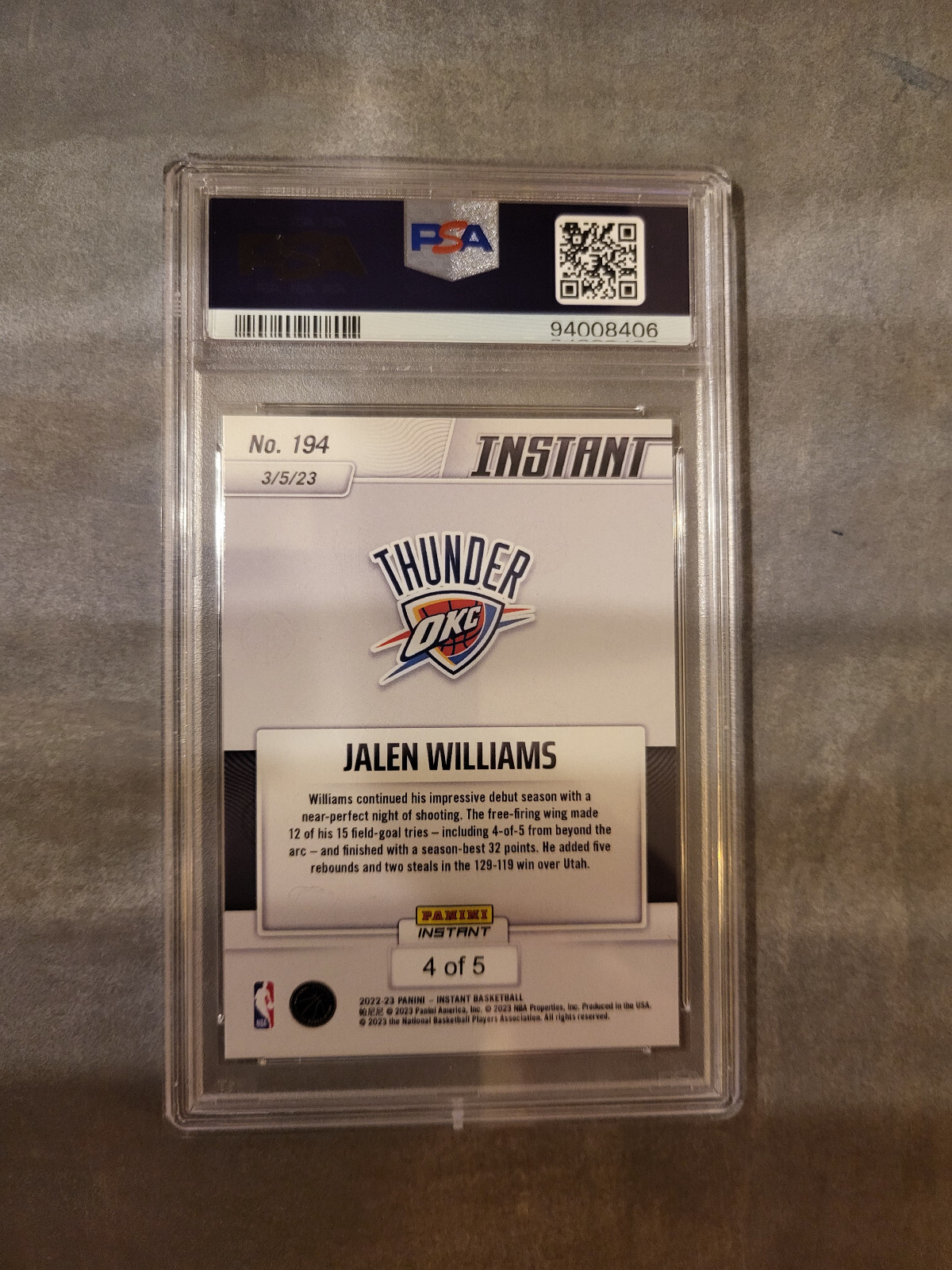 For the avid collector of sports trading cards, this 2022-23 Panini Instant Jalen Williams Rookie RC 194 Versicolor 4/5 PSA 9 is a must-have addition to your collection. This card features the up-and-coming basketball star from the Oklahoma City Thunder team and is a rare find with a limited print run of only 5. The card is in excellent shape and has been graded a PSA 9, ensuring its authenticity and value. As a short print, it's sure to be a highly sought-after item for fans and collectors alike. Don't miss your chance to add this unique card to your collection.