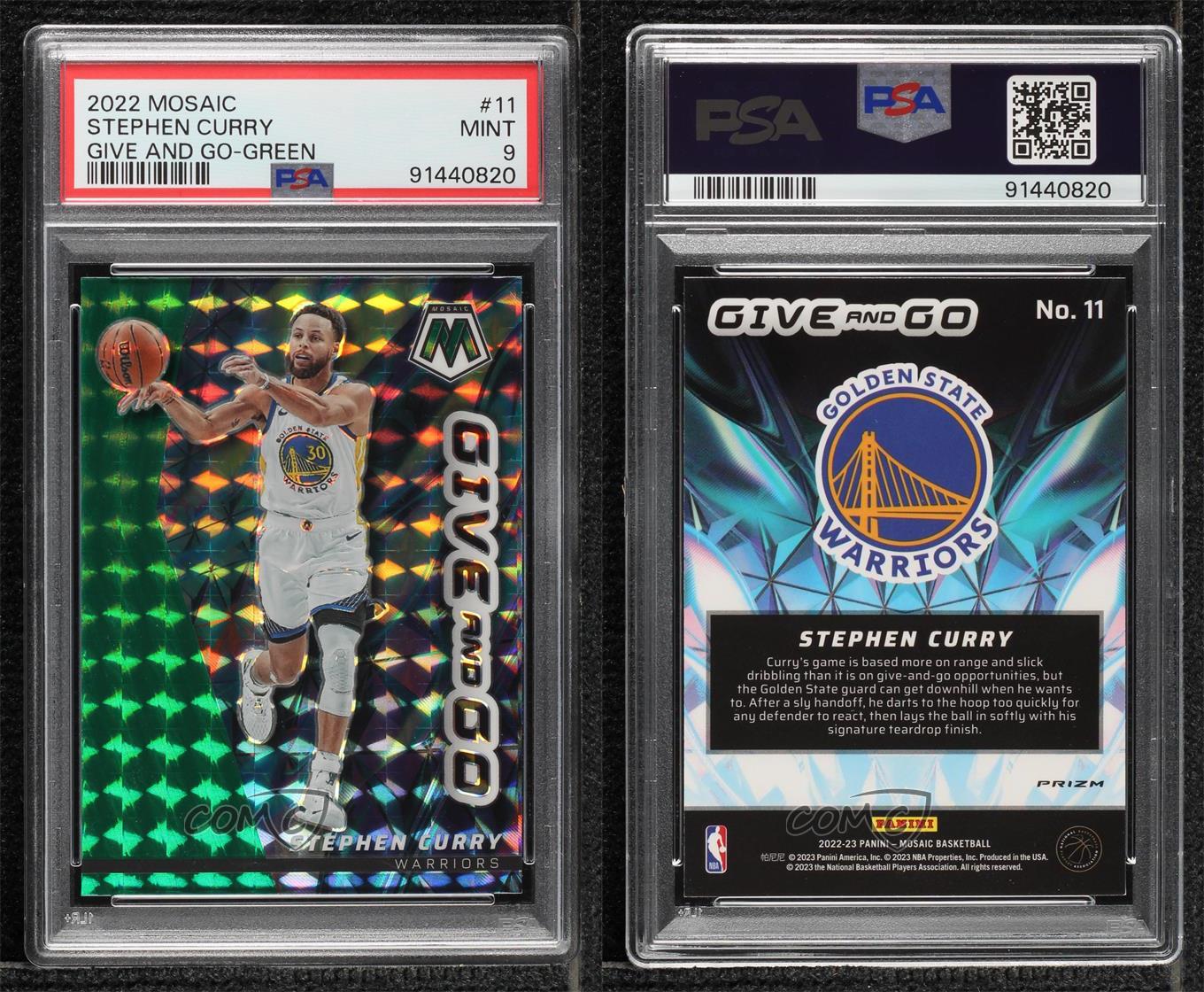 The product is a 2022-23 Panini Mosaic trading card featuring Stephen Curry of the Golden State Warriors. This specific card is part of the Insert Set "Give and Go Mosaic Green" and is a Green Prizm parallel variety. The card number is 11 and it is part of the 2022-23 NBA season collection. This card is a sought-after item for basketball card collectors and fans of Stephen Curry.