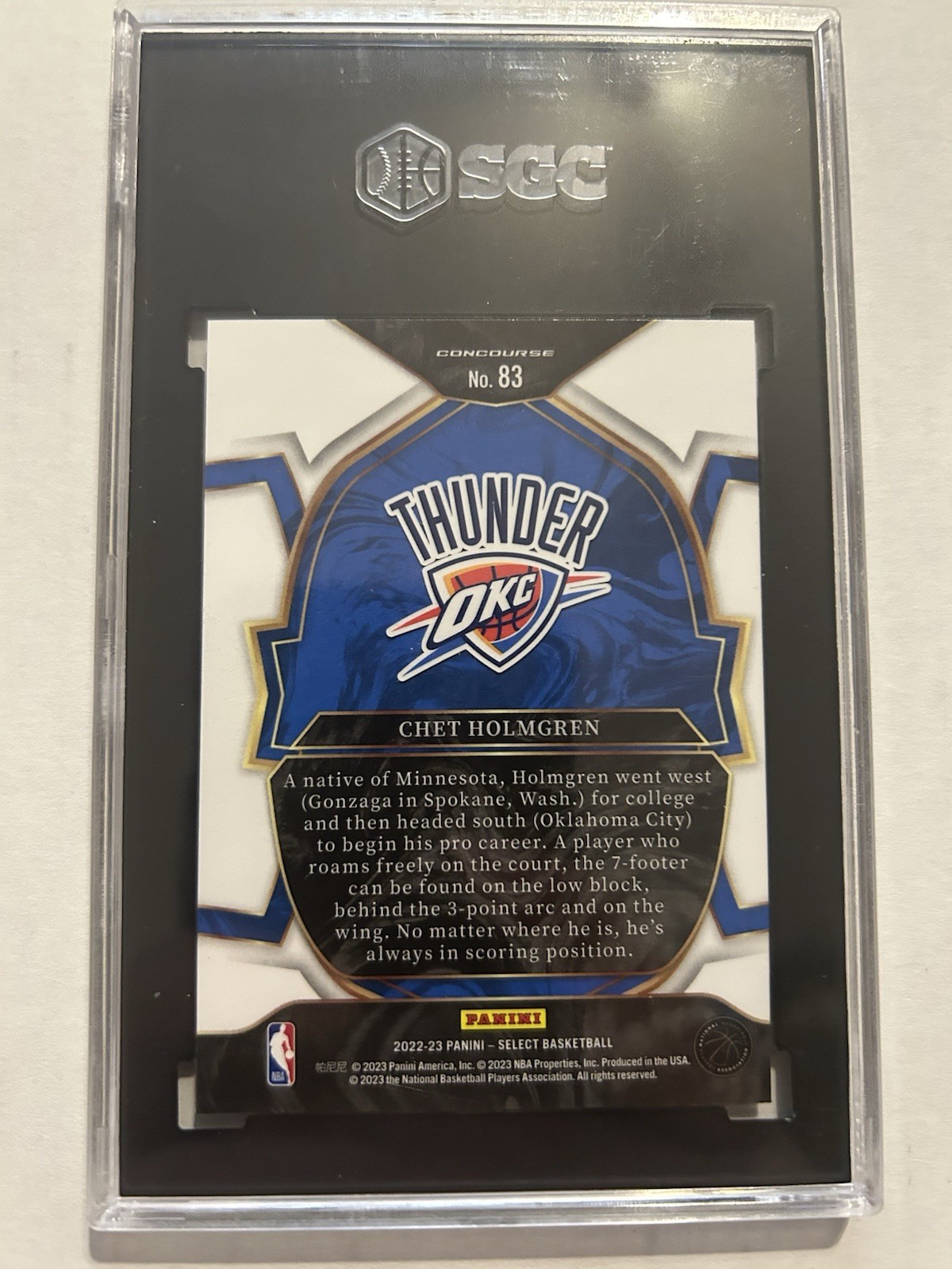 Card Number:83Sport:BasketballSeries:Panini SelectTeam:Oklahoma City ThunderManufacturer:PaniniAdditional Description:Concourse - Chet HolmgrenFeatures:Rookie, Base Set, Parallel/VarietyLeague:National Basketball Association (NBA)Player/Athlete:Chet HolmgrenParallel/Variety:Blue PrizmSeason:2022-23Subset:ConcourseSet:2022-23 Panini Selectbrand:Panini