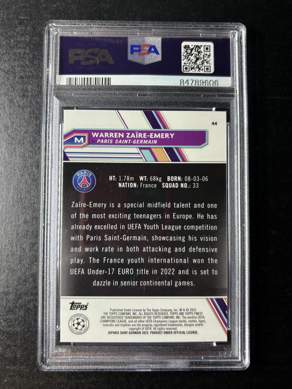 The product is a 2022-23 Topps Finest UEFA Club Competitions trading card featuring Warren Zaire-Emery of Paris Saint-Germain. This card has been professionally graded as a PSA 10, indicating it is in mint condition. The card is a limited print run of 125, with a green speckle design, making it a highly sought after collectible for soccer fans and card enthusiasts alike. Authenticated by Topps and graded by Professional Sports Authenticator (PSA), this original card is a valuable addition to any sports memorabilia collection.