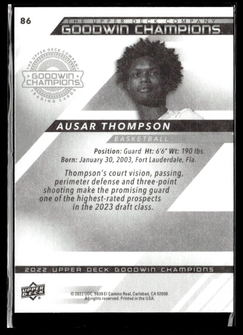 This Ausar Thompson rookie card from 2022-23 Upper Deck Goodwin Champions is a must-have for collectors! The design is sharp, the colors pop, and the card quality is top-notch. A great addition to any basketball or sports memorabilia collection. Check out our other stores for more amazing finds—whether you're into Pokémon, gaming, or more sports cards, we've got something for every collector!