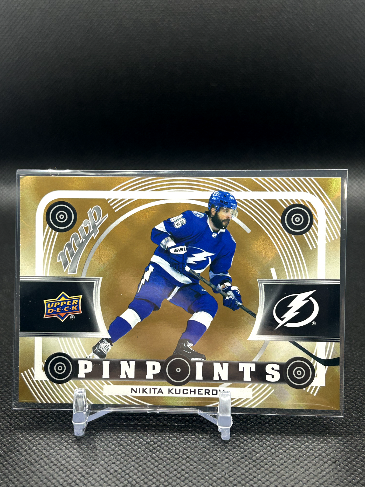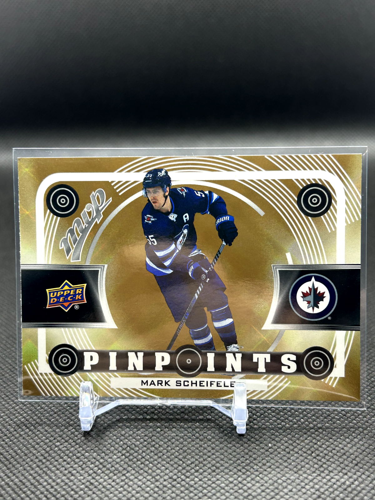 The 2022-23 MVP Hockey Pinpoints Gold trading card features top NHL players like Connor McDavid, Sidney Crosby, Auston Matthews, and Alex Ovechkin. Manufactured by Upper Deck, this English-language card is from the 2022-23 Upper Deck MVP set. It belongs to the MVP Gold parallel variety and includes inserts. The card showcases players from teams like the Winnipeg Jets, Pittsburgh Penguins, Tampa Bay Lightning, and Toronto Maple Leafs in the National Hockey League (NHL) season.