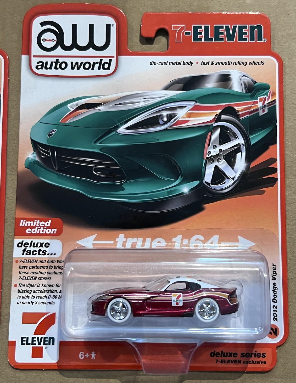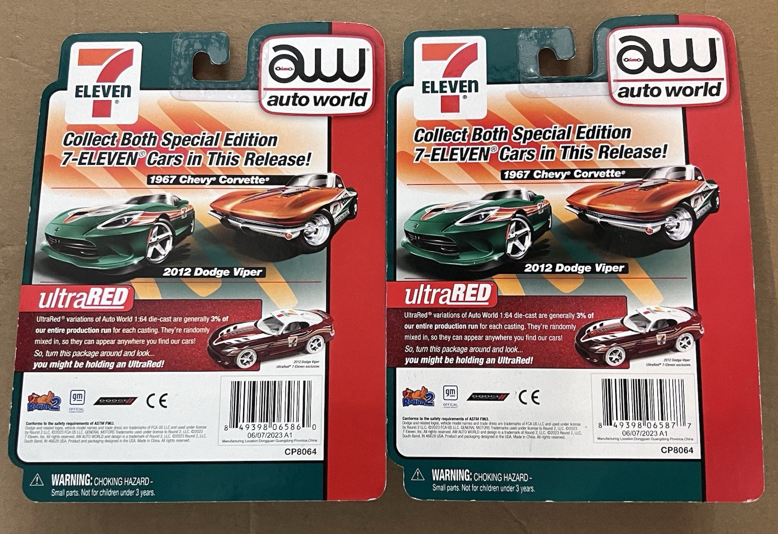 The Auto World 2023 7-Eleven 2012 Dodge Viper Ultra Red Chase and Regular is a highly detailed diecast toy car model of a 2012 Dodge Viper in a vibrant red color. This 1:64 scale collectible is part of the Auto World brand's Cars series and is sure to appeal to car enthusiasts and collectors alike. With its authentic design and high-quality construction, this Dodge Viper model is a must-have addition to any diecast vehicle collection. The items are new in package, and the packaging is in good condition with some minor/faint makrings on the edge. Sold as is. See photos for details.