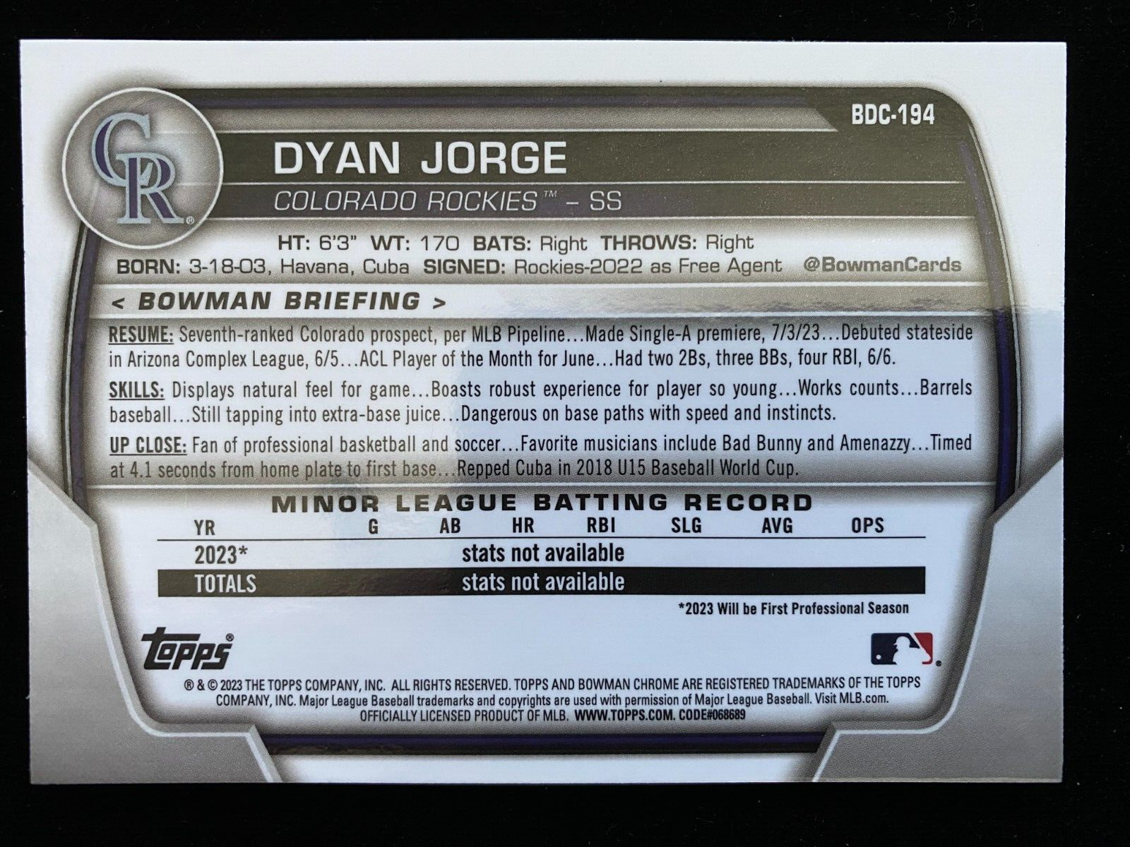 2023 Bowman Chrome Draft DYAN JORGE #BDC-194 YELLOW REFRACTOR #32/75 Rockies SP All cards are at least NRMT unless noted. Some raw cards I list are potential GEM Mint Cards, but please note that all raw ungraded cards may contain pixelated dimples, scratches, printer lines, indents, edge chipping or corner whitening, along with other common condition issues. The card/s pictured in each listing is the card/s received, if you have condition questions please ask. If you're looking for guaranteed GEM MINT 10 cards then I suggest buying cards that are already graded. I will not accept returns under any circumstances, buying sports cards is similar to buying stocks and you cannot return stocks, so please do not try and return the card to me. Most are pulled by me directly from packs and immediately put into sleeves, I do not inspect every card for every potential flaw, so card/s could have no flaws. Card ships USPS, if the card sells for under $20 it will be shipped in PWE, if the card sells for more than $20 it will ship GROUND ADVANTAGE, regardless of S&H cost, I don't know how much the card is going to sell for before it's sold, so I'm just guessing. If auction ends for less than $20 and you would like me to ship in a bubble mailer, please let me know before paying for the auction and I will send an updated invoice. If Auction sells for more than $20 with a low S&H charge I will cover additional cost to ship. Combined shipping is available, at roughly one dollar per additional Listing, with a cap around $10 depending on weight.