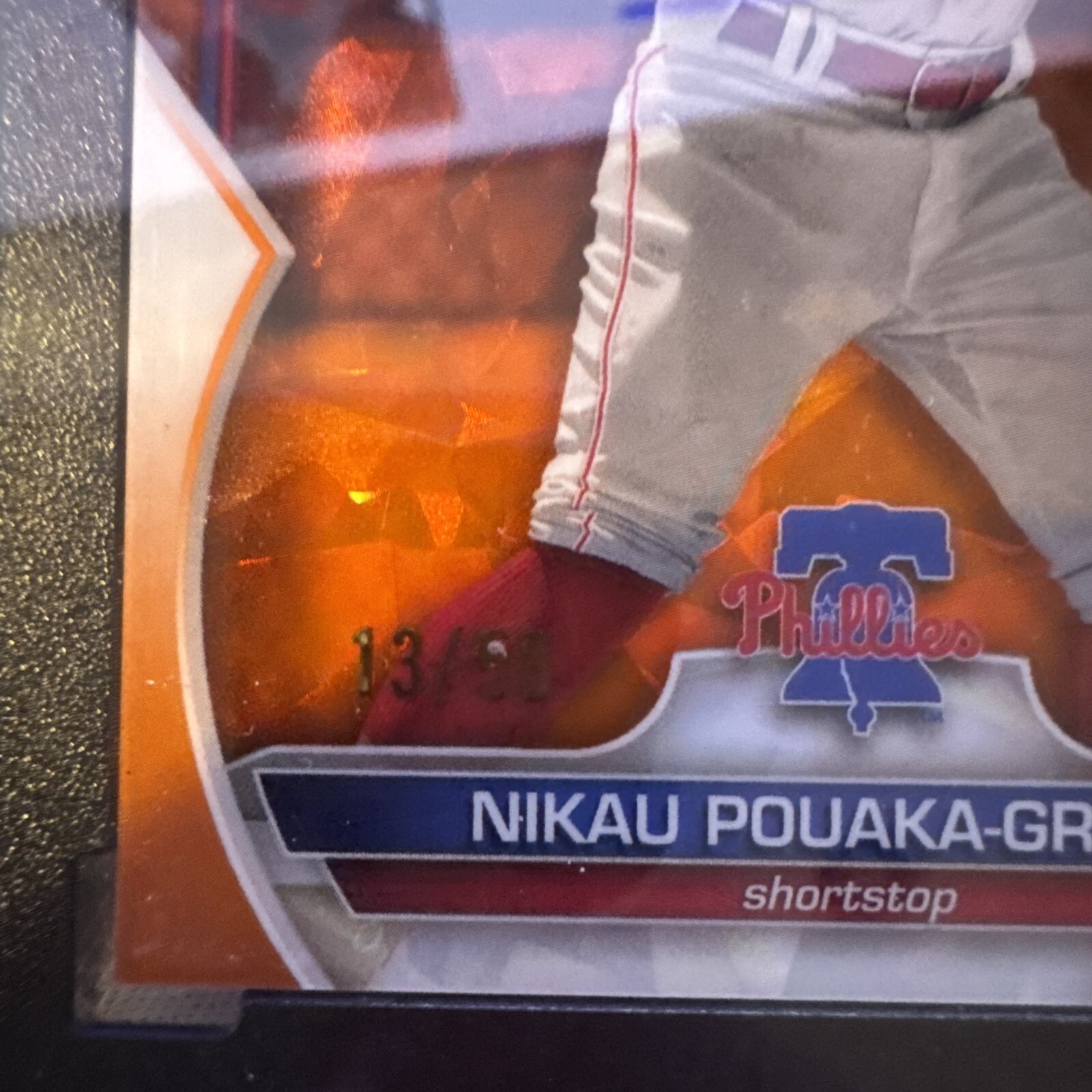 Capture the essence of baseball's future with the 2023 Bowman Chrome Draft Sapphire Prospects Orange Nikau Pouaka-Gredo card, a sought-after collectible for fans and investors alike. Serial numbered to ensure uniqueness, this card features the promising talent of Nikau Pouaka-Grego, of the Philadelphia Phillies, encapsulated in pristine detail by the Topps Co. Graded a perfect 10 by the Sportscard Guaranty Corporation (SGC), this single card is a testament to quality and craftsmanship. A modern-era gem from the 2023 collection, it's an original piece that celebrates the spirit of the sport and the potential of a rising star.