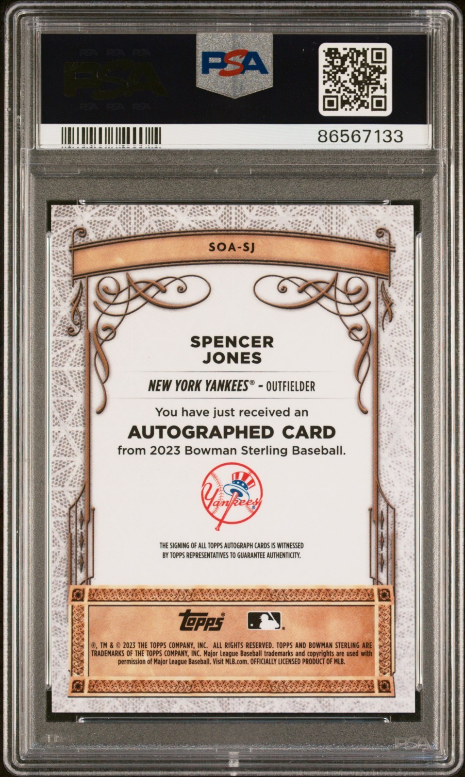 The product is a 2023 Bowman Sterling Spencer Jones Opulence Auto trading card, featuring a hard-signed autograph from the player. This limited edition card is numbered out of 99 and has received a PSA 10 grade for its quality. It is part of the Sterling Opulence Autographs insert set, manufactured by Bowman and authenticated by Topps. The card belongs to the Major League Baseball (MLB) league and represents the New York Yankees team, making it a desirable collectible for baseball fans and trading card enthusiasts.