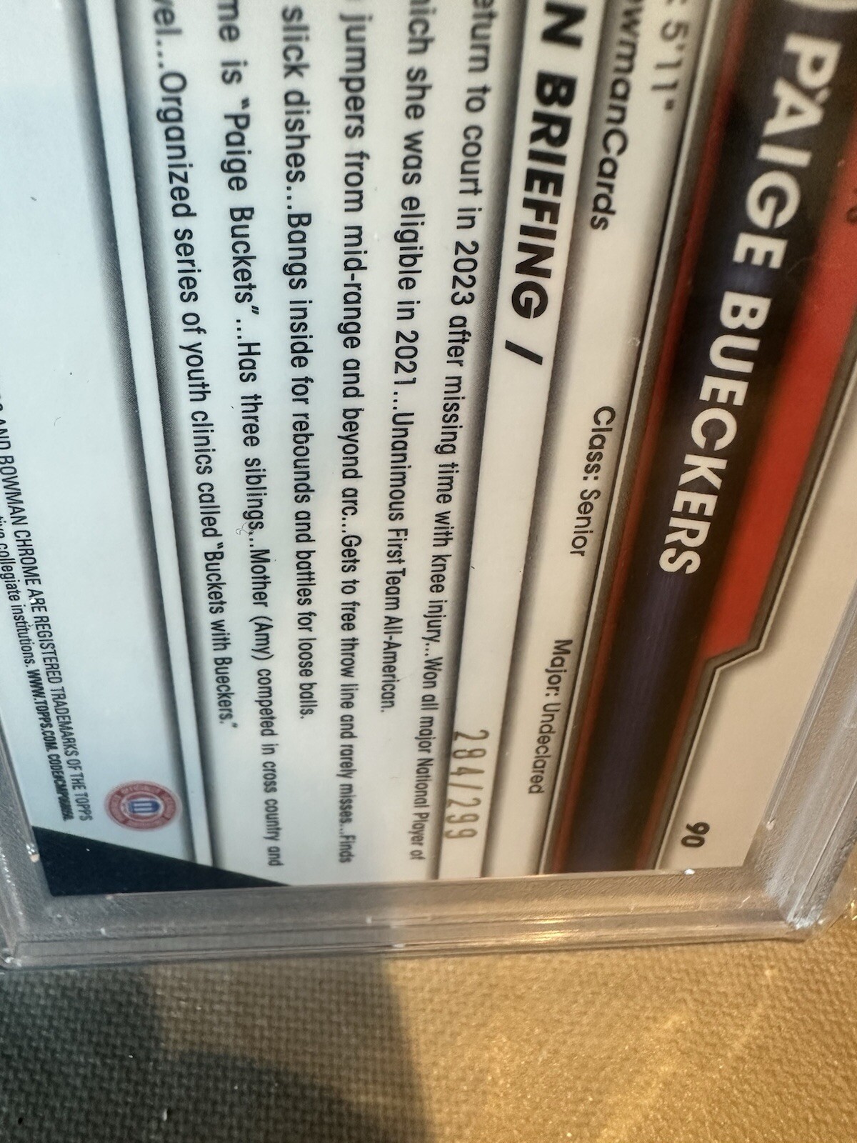 2023 Bowman Chrome Paige Bueckers Aqua Refractor #90 PSA 10 is a sports trading card featuring rookie basketball player Paige Bueckers from the UConn Huskies. This card is from the National Collegiate Athletic Association (NCAA) league and manufactured by Bowman for the 2023 season. It has a unique Aqua parallel variety and is graded as a PSA 10, indicating it is in excellent condition.