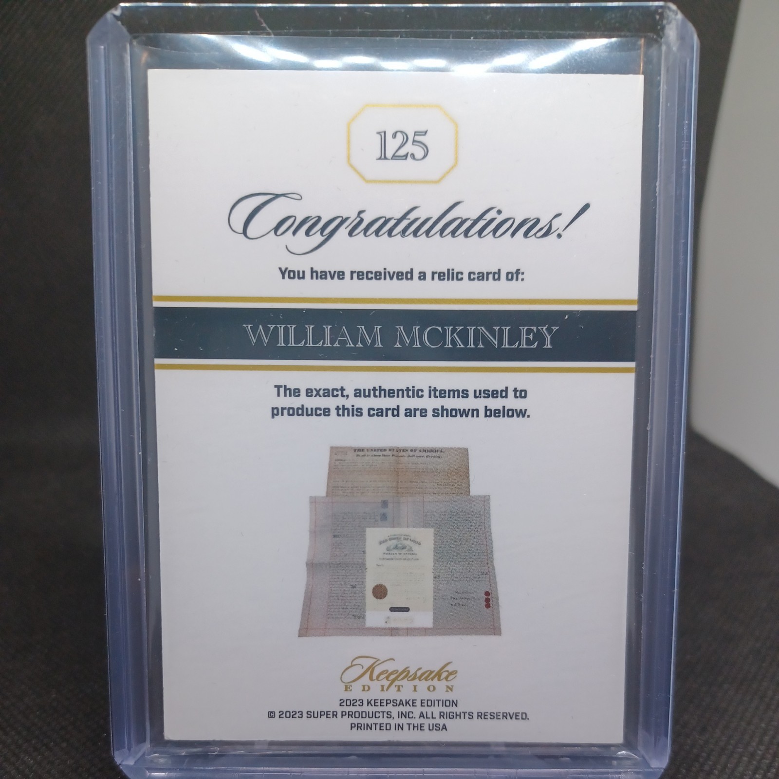 The 2023 Keepsake Edition William McKinley #125 hand written relic 1/1 auto with box is a highly collectible and unique trading card featuring an original autograph of the famous politician. This limited edition card is part of the Keepsake Edition set by Super Products, making it a valuable addition to any history or political memorabilia collection. With its near mint condition and premium features like being serial numbered, framed, and stamped, this card is a rare find for enthusiasts of historical trading cards.