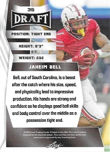 The product is a 2023 Leaf Draft Jaheim Bell rookie trading card featuring the player in the National Football League (NFL). This standard-sized card is made of card stock and is part of the base set for that season. The card number is 35 and it does not include an autograph. It is an insert card from Leaf's 2023 Draft set, perfect for collectors and fans of football memorabilia.