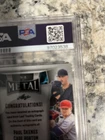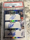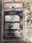 This 2023 Leaf Metal trading card features autographs from Paul Skenes, Cade Horton and Rhett Lowder, making it a must-have for sports trading card collectors. The blue parallel/variety adds an extra layer of uniqueness to this already valuable card. It has been professionally graded by PSA and received a 9 Mint rating. Leaf is known for producing high-quality sports trading cards, and this 2023 Metal set is no exception. The card is in excellent condition and will make a great addition to any collection. Don't miss your chance to own this rare and valuable trading card.