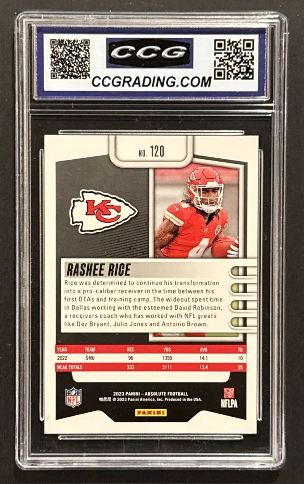 Card Number:120Series:Panini AbsoluteParallel/Variety:[Base]Team:Kansas City ChiefsPlayer/Athlete:Rashee RiceManufacturer:PaniniSet:2023 Panini AbsoluteSport:Footballbrand:PaniniLeague:National Football League (NFL)Season:2023Additional Description:Rookies - Rashee RiceSubset:RookiesFeatures:Rookie, Base Set