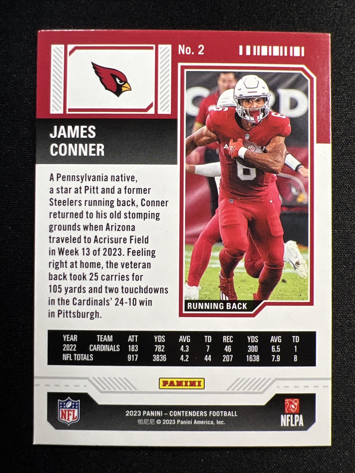 This 2023 Panini Contenders NFL Game Ticket/Red #2 card features James Conner of the Arizona Cardinals. The card is made of 20 Pt. card stock and is an original from the United States. It is a Sports Trading Card with a Parallel/Variety and Insert feature. The card is in English language and has a National Football League (NFL) and NFL/NCAA/Football event/tournament aspect. The Arizona Prop 65 Warning does not apply to this card. **Bonus cards are sent with this item, cards are randomly picked and may include new/used, sport, mixed-sport or themed cards in any condition. If you have a personal preference on bonus cards, please add a "buyers note" to your order, and we will do our best to include specified sport, team, mixed-sport, or themed bonus cards.** **The Card Pictured is the EXACT card that you are bidding/buying. Please review Pictures and card condition carefully.** Find hundreds of categorized cards in our Ebay Store! Please visit our store and give us a follow! TONS of AMAZING deals, Store specials and daily postings! Be sure to give us a follow to receive information on our Deals, Coupons and daily listings! *Shipping* All orders include tracking and insurance. Orders containing 1-9 cards are sent in a certified eBay trading card envelope. Cards are packed and sent out with upmost care as we understand the importance of preservation with being a collector. Purchased cards will be placed into a new penny sleeve prior shipping. Bonus Cards are randomly pulled at the time of packing and will not include a penny sleeve. **Cards with a selling price of $15 or more will be secured in a penny sleeve and top-loader and mailed USPS Priority with tracking and insurance protection.** Thank you! Please check out our eBay store and other listings! Please, feel free to reach out with any questions, and please keep an eye out for our listings that include a charity donation to the American Stroke Foundation!