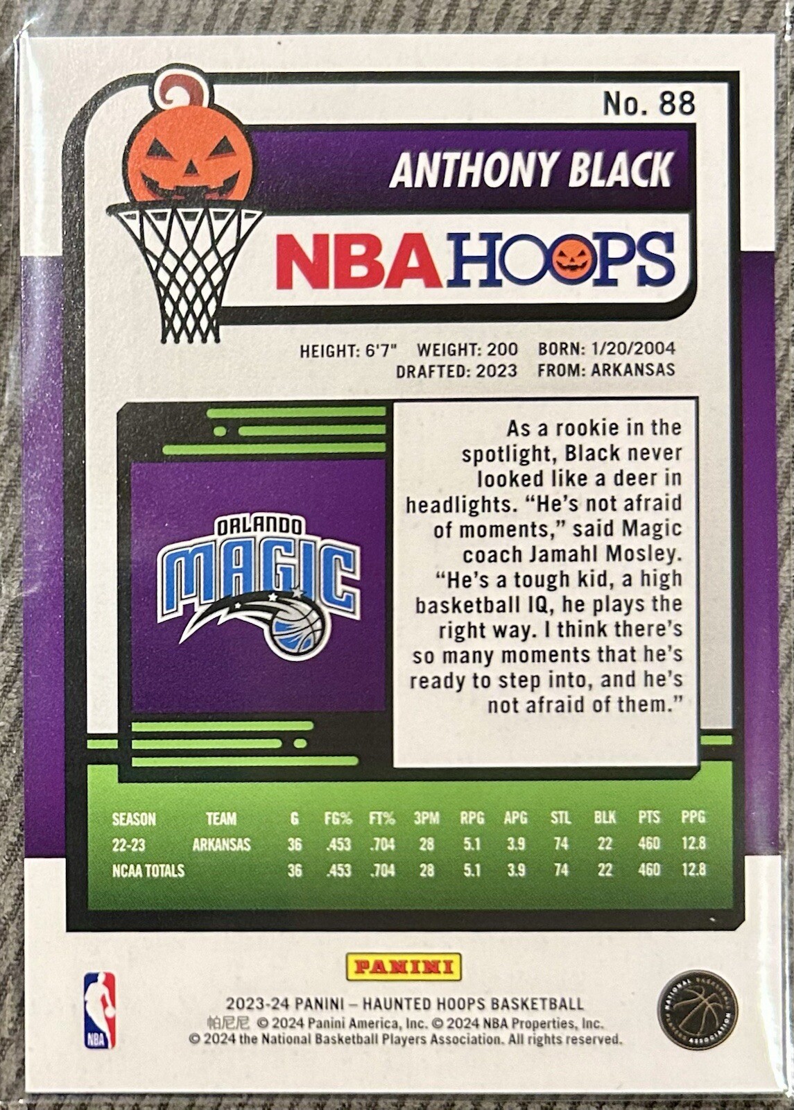 This Anthony Black sports trading card is a must-have for any basketball fan. Featuring a web design, this short print rookie card is from the 2023-24 Panini Haunted NBA Hoops set. The card showcases the Orlando Magic player in his debut season, and is numbered 88 out of 222 cards in the set. With attributes such as autographed (No), player/athlete (Anthony Black), sport (Basketball), type (Sports Trading Card), parallel/variety (Web) card name (Anthony Black - Web SP), manufacturer (Panini), features (Short Print, Rookie), team (Orlando Magic), card number (88), and season (2023-24), this card is a valuable addition to any collection. Get your hands on this rare card now!