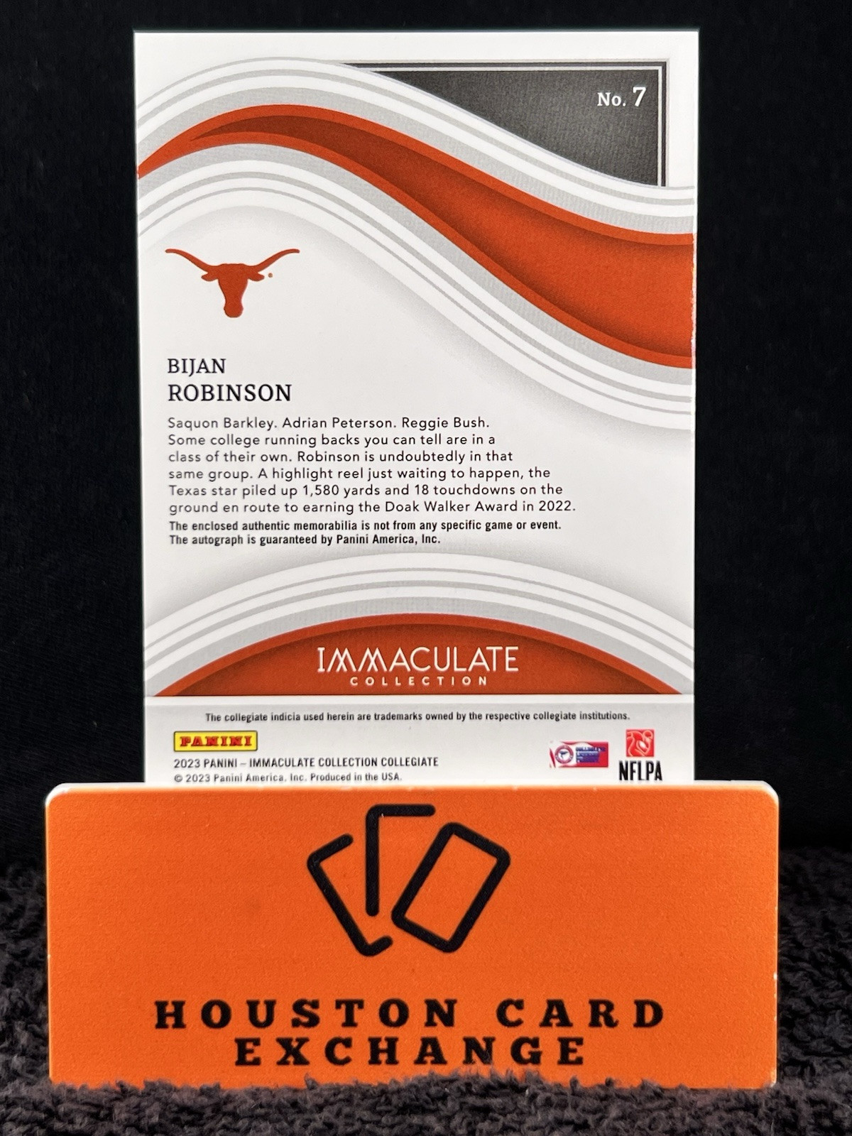 Elevate your sports card collection with the 2023 Panini Immaculate Collegiate Bijan Robinson RC/Auto/Patch, a limited edition treasure numbered to just 1 in 10. This card celebrates the dynamic talents of Bijan Robinson, showcasing his time with both the Atlanta Falcons and the Texas Longhorns. Its patch variety adds a unique tactile dimension, complemented by the authenticity of a hard-signed autograph verified by Panini Authentic. Constructed with premium card stock and featuring rookie designation, this card is a must-have for fans and collectors alike. It's a snapshot of a promising career in the NFL and NCAA, encapsulated in a collectible that honors the sport of football and the athletes who inspire.