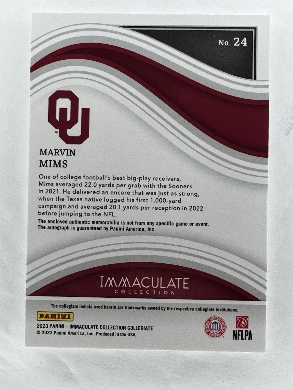 Elevate your collection with the 2023 Panini Immaculate Collegiate Marvin Mims Rookie Patch Auto card, an exquisite find for enthusiasts and fans alike. Featuring a vibrant patch and Marvin Mims' crisp autograph, this card is a standout piece, numbered 73 out of 99, ensuring its exclusivity. With its roots in both the Denver Broncos and Oklahoma Sooners legacy, this card not only embodies the spirit of football but also carries a piece of sports history. A treasure from the Collegiate Collection, it is a must-have for those who appreciate the blend of memorabilia and athletic prowess.