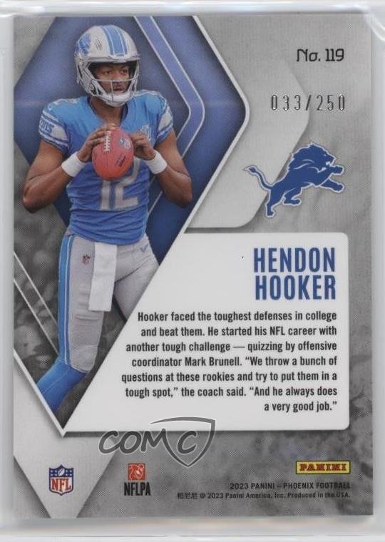 League:National Football League (NFL)Features:Rookie, Serial Numbered, Base Set, Parallel/VarietyPrint Run:250Season:2023Subset:RookiesPlayer/Athlete:Hendon HookerSeries:Panini PhoenixSet:2023 Panini PhoenixAdditional Description:Rookies - Hendon Hookerbrand:PaniniCard Number:119Sport:FootballTeam:Detroit LionsManufacturer:PaniniParallel/Variety:Red