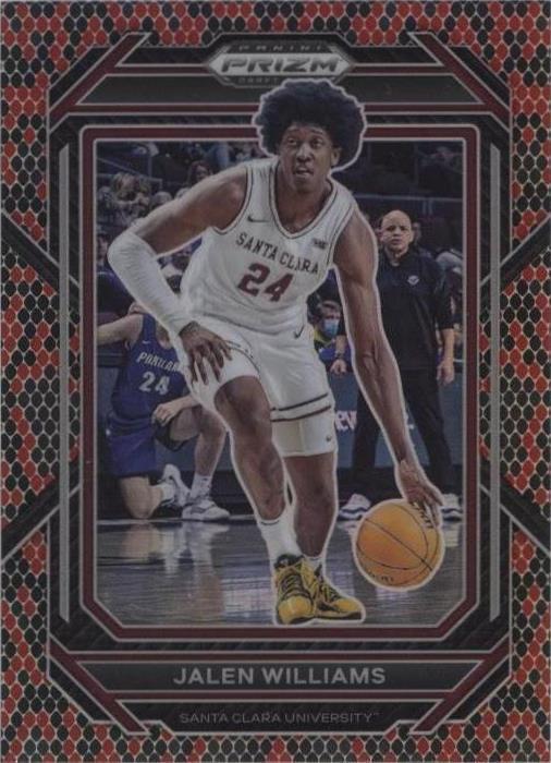 This 2023 Panini Prizm Draft Picks sports trading card features Jalen Williams, a player for both the Oklahoma City Thunder and Santa Clara Broncos. The card is a short print with a card number of 99 and falls under the Prizm parallel/variety. It is a great addition to any collection for fans of basketball and the National Basketball Association (NBA) and National Collegiate Athletic Association (NCAA). The card has been graded as PSA Gem Mint 10, ensuring its quality and authenticity.