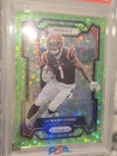 This 2023 Panini Prizm No Huddle Trading Card features Ja'Marr Chase of the Cincinnati Bengals. The card is made of high-quality card stock and is part of the Purple Prizm No Huddle Insert Set. It has a print run of only 5 and features a neon green design. The card is graded PSA 9 and has a jersey match to Ja'Marr Chase. It is an original card and manufactured by Panini Prizm in the United States. This card is perfect for any National Football League (NFL) fan and collector of sports trading cards.