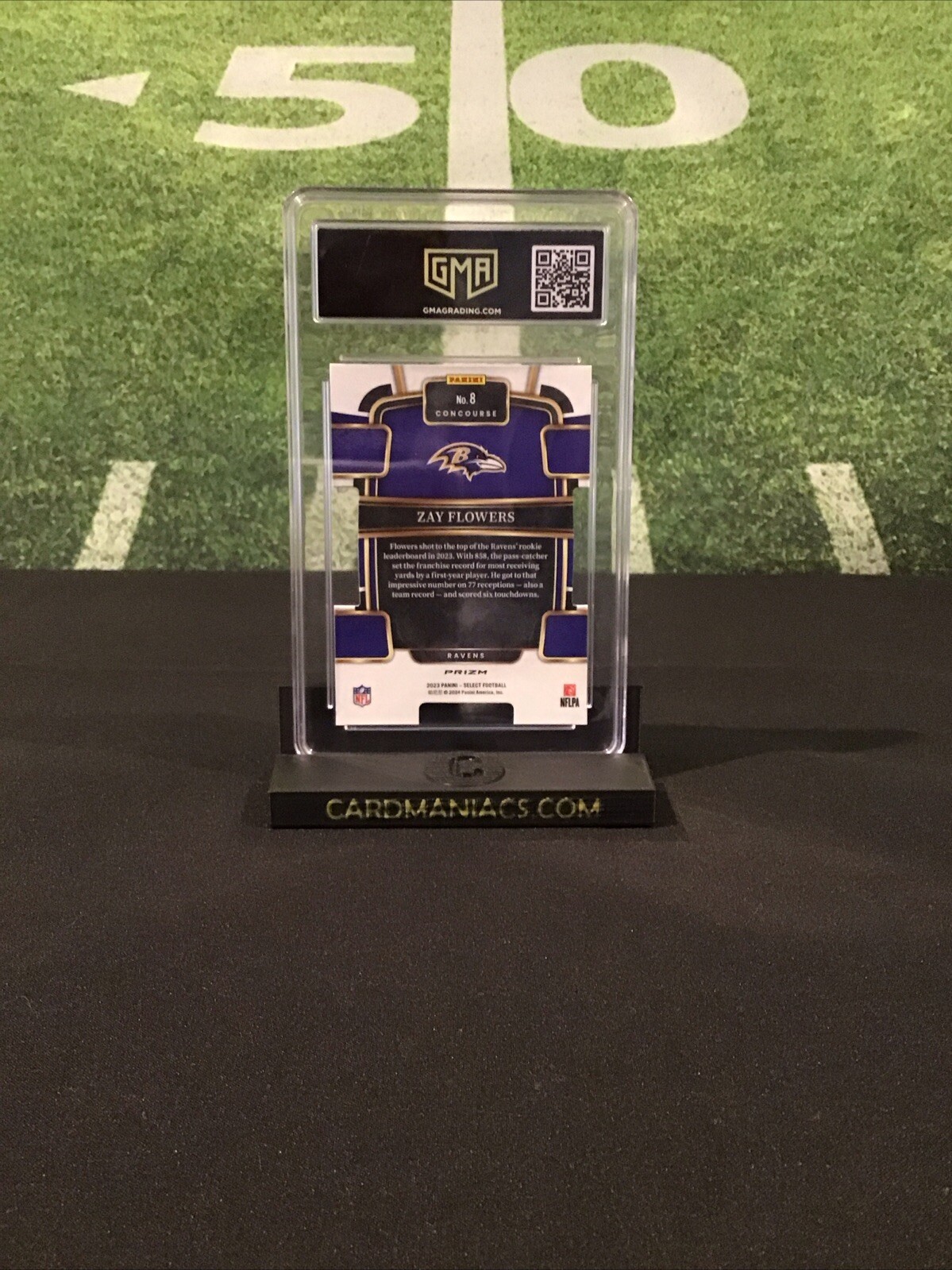 The 2023 Panini Select card features Zay Flowers in the Concourse Red & Yellow Prizm Die-Cut design. Professionally graded as a Gem Mint 10 by Gem Mint Authentication (GMA), this rookie card is a valuable addition to any sports trading card collection.