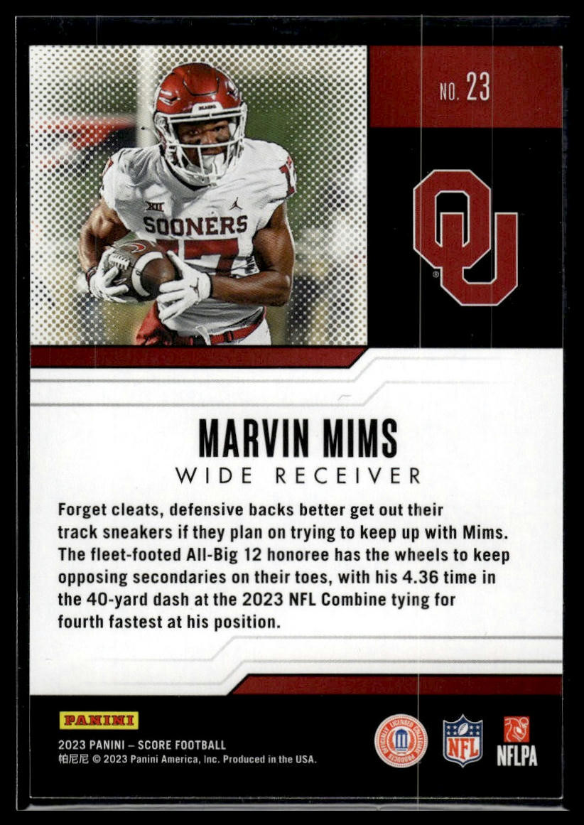 This is a nice example of a 2023 Score #23 Marvin Mims Protential Other important information about this card: Rookie RC,Chase In 2023 Marvin Mims played for the Oklahoma Sooners. Please check out our other listings for more great cards.