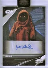 The 2023 Topps Chrome Black JAWA Autograph Refractor trading card features an autograph from Leilani Shiu, who portrayed a Jawa character in Star Wars: Episode IV – A New Hope. This collectible card is part of the Star Wars and Mandalorian franchises and is manufactured by Topps. The card is a non-sport trading card with a refractor parallel/variety, making it a rare and sought-after item for fans of the action genre.
