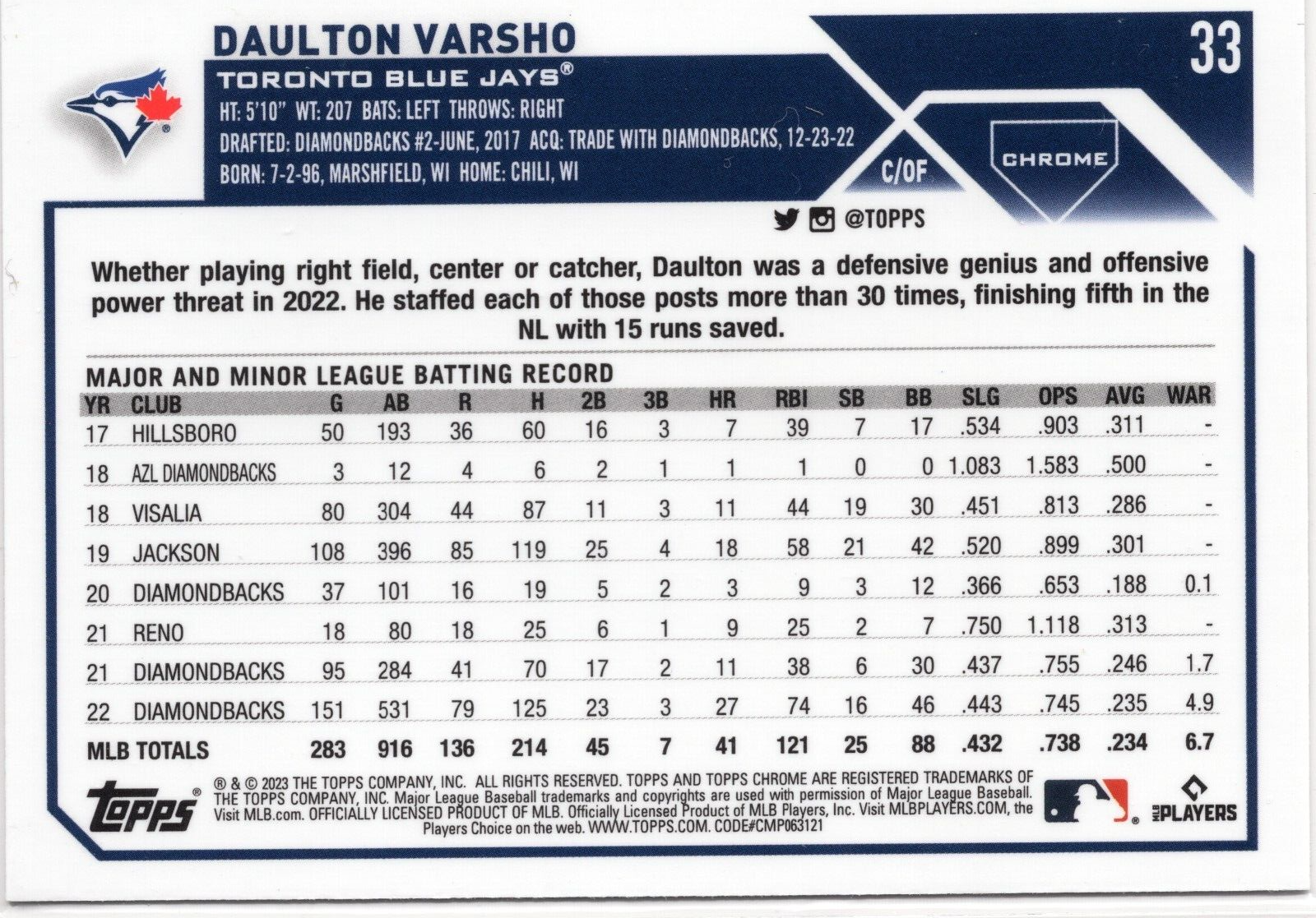 This is a 2023 Topps Chrome Sepia Refractor trading card featuring Daulton Varsho, a player from the Toronto Blue Jays team. The card is made of card stock and has a thickness of 35 Pt. It is an original card manufactured by Topps and is part of the base set. The card is a parallel variety and has a sepia refractor finish. It was produced in the United States in 2023 and commemorates the MLB World Series event/tournament.