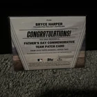 This 2023 Topps Series 2 trading card features a special Father's Day commemorative team patches design, with Bryce Harper as the featured player. The card is a sports trading card type, and has a patch parallel/variety, making it a unique addition to any collection. The card is in excellent shape, near mint or better, and has not been graded. It is a great choice for fans of Bryce Harper or collectors of sports trading cards.