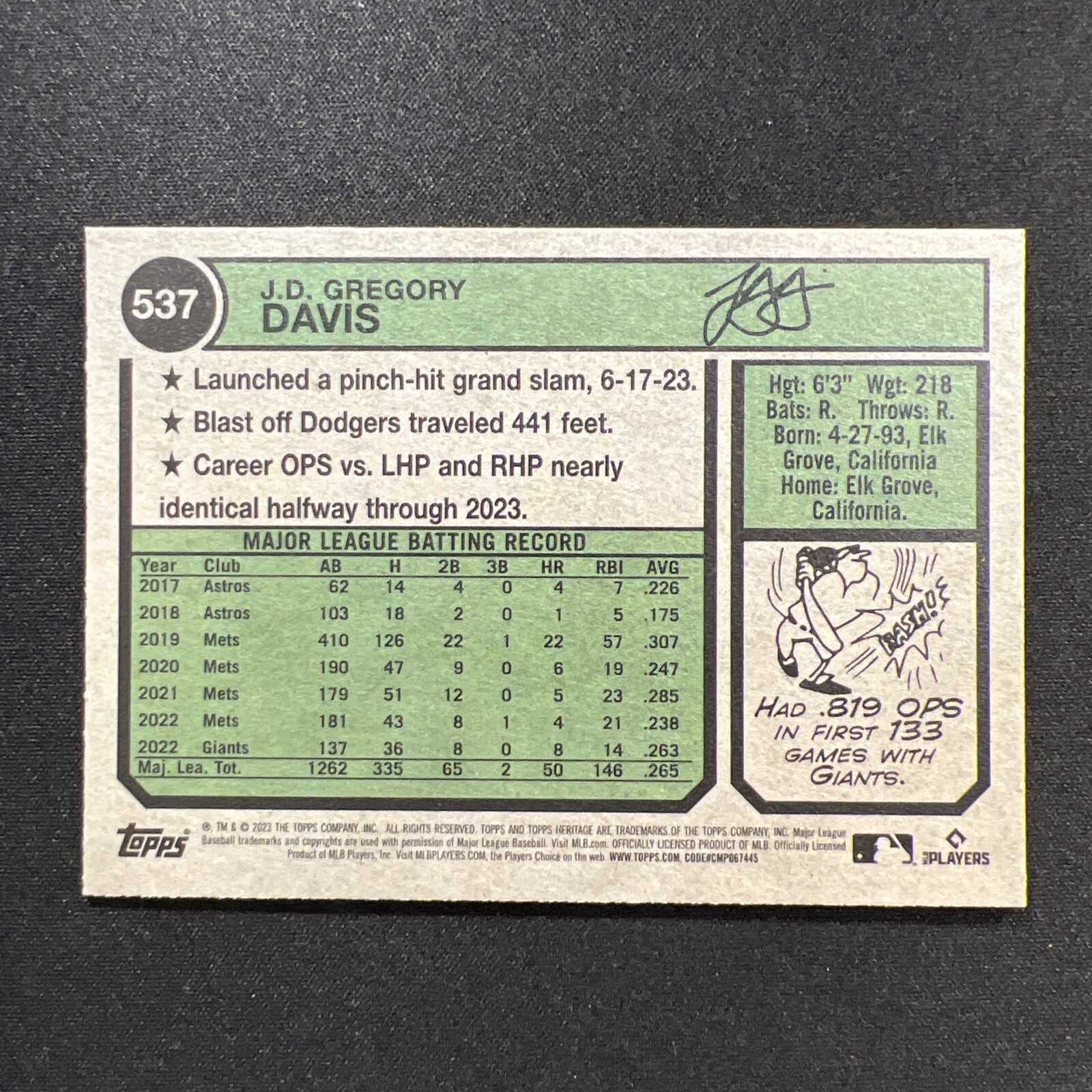 This is a 2023 Topps Heritage High Number Series trading card featuring J.D. Davis, a player for the San Francisco Giants. The card is made of 35 Pt. card stock and is an original Topps production. It is a single-insert card from the base set, with no autograph or vintage designation. The card is in English and has the card number 537. It is part of the Major League (MLB) season and was manufactured in the United States. This card is a great addition to any baseball fan's collection and is sure to impress. **Bonus cards are sent with this item, cards are randomly picked and may include new/used, sport, mixed-sport or themed cards in any condition. If you have a personal preference on bonus cards, please add a "buyers note" to your order, and we will do our best to include specified sport, team, mixed-sport, or themed bonus cards.** **The Card Pictured is the EXACT card that you are bidding/buying. Please review Pictures and card condition carefully.** Find hundreds of categorized cards in our Ebay Store! Please visit our store and give us a follow! TONS of AMAZING deals, Store specials and daily postings! Be sure to give us a follow to receive information on our Deals, Coupons and daily listings! *Shipping* All orders include tracking and insurance. Orders containing 1-9 cards are sent in a certified eBay trading card envelope. Cards are packed and sent out with upmost care as we understand the importance of preservation with being a collector. Purchased cards will be placed into a new penny sleeve prior shipping. Bonus Cards are randomly pulled at the time of packing and will not include a penny sleeve. **Cards with a selling price of $15 or more will be secured in a penny sleeve and top-loader and mailed USPS Priority with tracking and insurance protection.** Thank you! Please check out our eBay store and other listings! Please, feel free to reach out with any questions, and please keep an eye out for our listings that include a charity donation to the American Stroke Foundation!