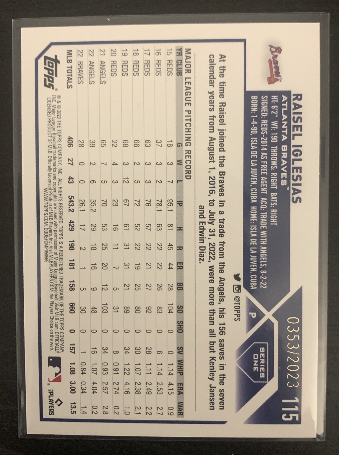 2023 Topps Series 1 #115 Raisel Iglesias Gold Parallel /2023 Atlanta Braves Baseball Card