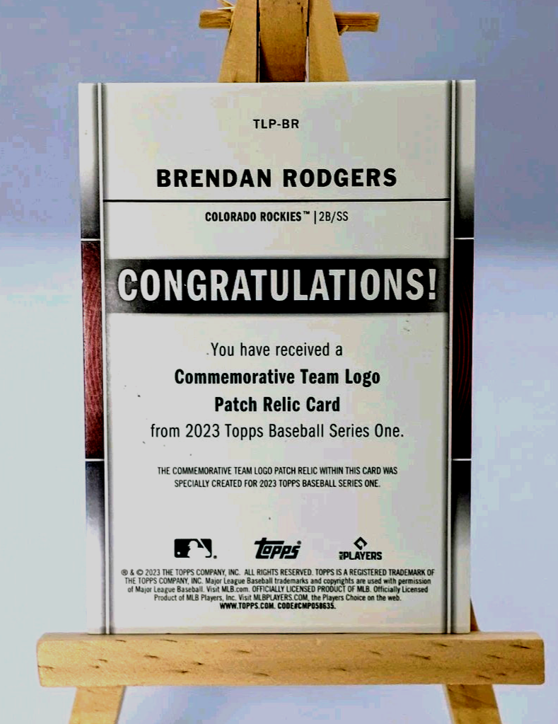 This is a 2023 Topps Series 1 sports trading card featuring Brendan Rodgers of the Colorado Rockies. It is part of the Team Logo Commemorative Patches insert set and has a card number of TLP-BR. The card showcases the team logo and is a base parallel variety manufactured by Topps for Major League Baseball. I am adding sports cards as well as other items daily so save my store! I can bundle.