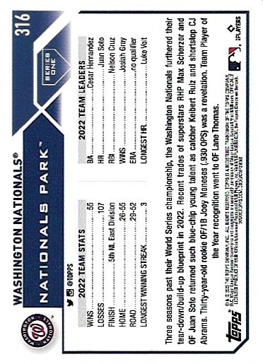 This is a 2023 Topps Series 1 Team Card featuring the Washington Nationals. The card measures 3½" x 2½" and is an original licensed reprint. It is part of the 2023 Topps Series 1 set and has the card number 316. The card showcases the Washington Nationals team and is perfect for any baseball fan or collector. This sports trading card is a great addition to any collection or a perfect gift for a baseball enthusiast. It is manufactured by Topps and is an authentic piece of sports memorabilia. Add this card to your collection today and show off your love for the Washington Nationals!
