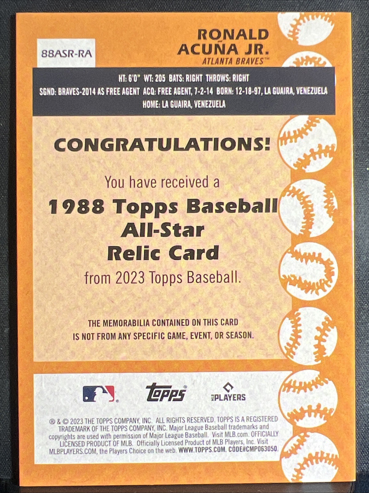 This Ronald Acuña Jr. relic card is a must-have for any collector! The condition is flawless—sharp corners, no print lines, and the memorabilia piece looks fantastic. A perfect addition to my collection, and the 1988 Topps All-Star design gives it a cool retro vibe. Highly recommend!