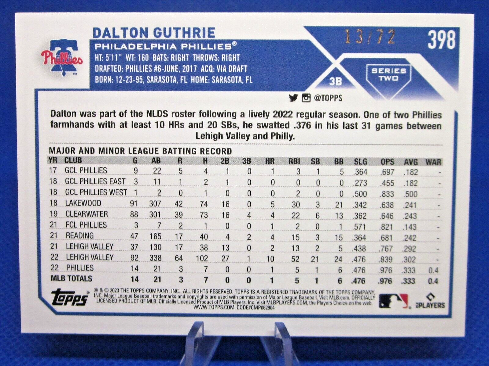 Here I have a 2023 Topps Series 2 Black Border Parallel rookie card of Dalton Guthrie. This card is number 398. It is serial numbered 13 of only 72. I have a lot of rookie cards, short prints and parallel cards from different years and different series listed. Please check them out. I offer free shipping on all my items. Your card will be shipped in a semi rigid top loader inside a plain white envelope with a shipping label attached with a tracking number. Any orders that total over $20 will be shipped in a bubble mailer with a tracking number. I have been with Ebay since 2002 and have maintained a 100 percent positive feedback throughout. So buy from a trusted seller. Please feel free to ask any questions.
