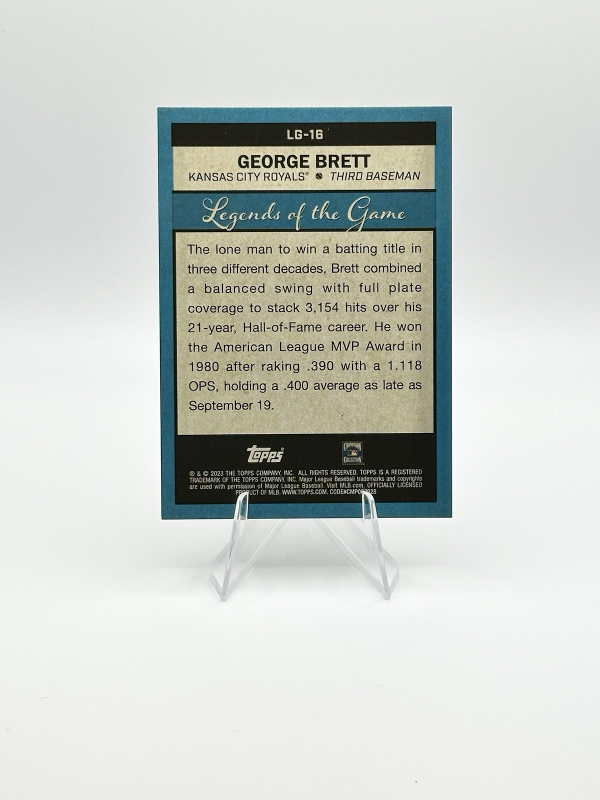 It is a 2023 Topps Series 2 George Brett trading card from the Legends of the Game insert set. This black parallel version is serial numbered out of 299 and features the former Kansas City Royals player. The card is manufactured by Topps and is a part of Major League Baseball (MLB) sports trading cards for the 2023 season.
