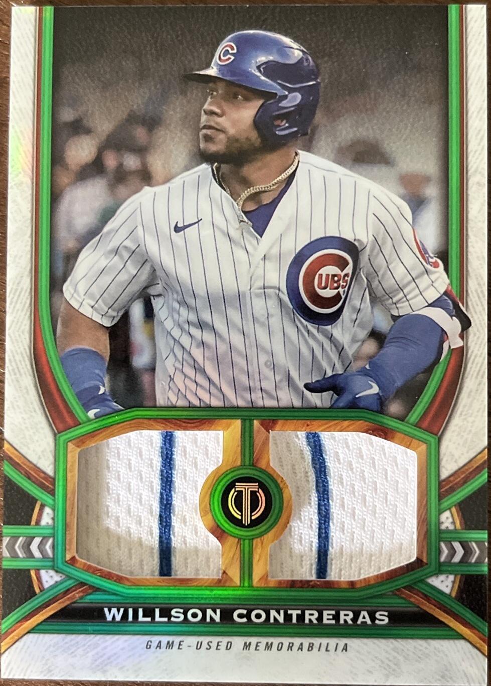 Just pulled this Willson Contreras dual relic from 2023 Topps Tribute, and it’s a beauty! The green parallel /99 makes it even more special, and the dual memorabilia swatches look sharp. As a fan, owning a piece of game-worn gear feels amazing—great addition to my collection. Highly recommend for any Cubs or Contreras collector!