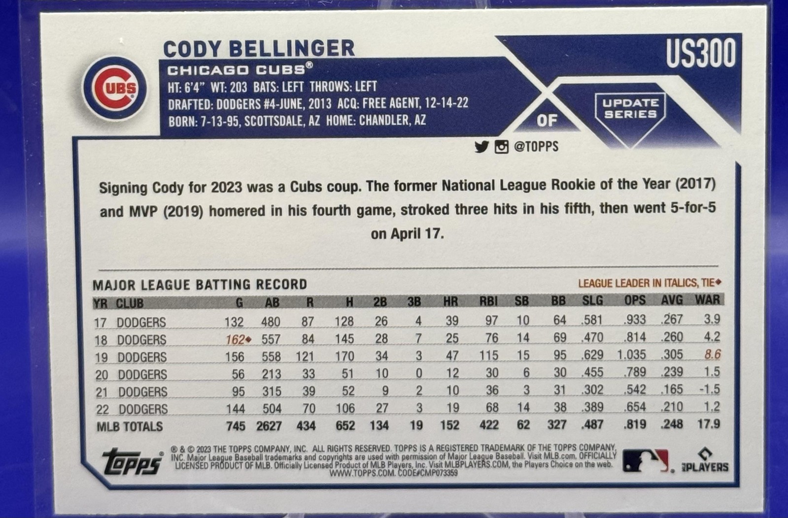 The Card pictured is the card you will receive unless there are multiple quantities then you will receive a card in the comparable grade. Cards in poor condition could have creasing, stains, rounded corners, pen marks or a combo of them. please see pics for a better understanding of cards condition. Excellent Chicago Cubs Orange and Black Foil Cody Bellinger #US300 2023 Topps Update Topps 2023 Baseball .
