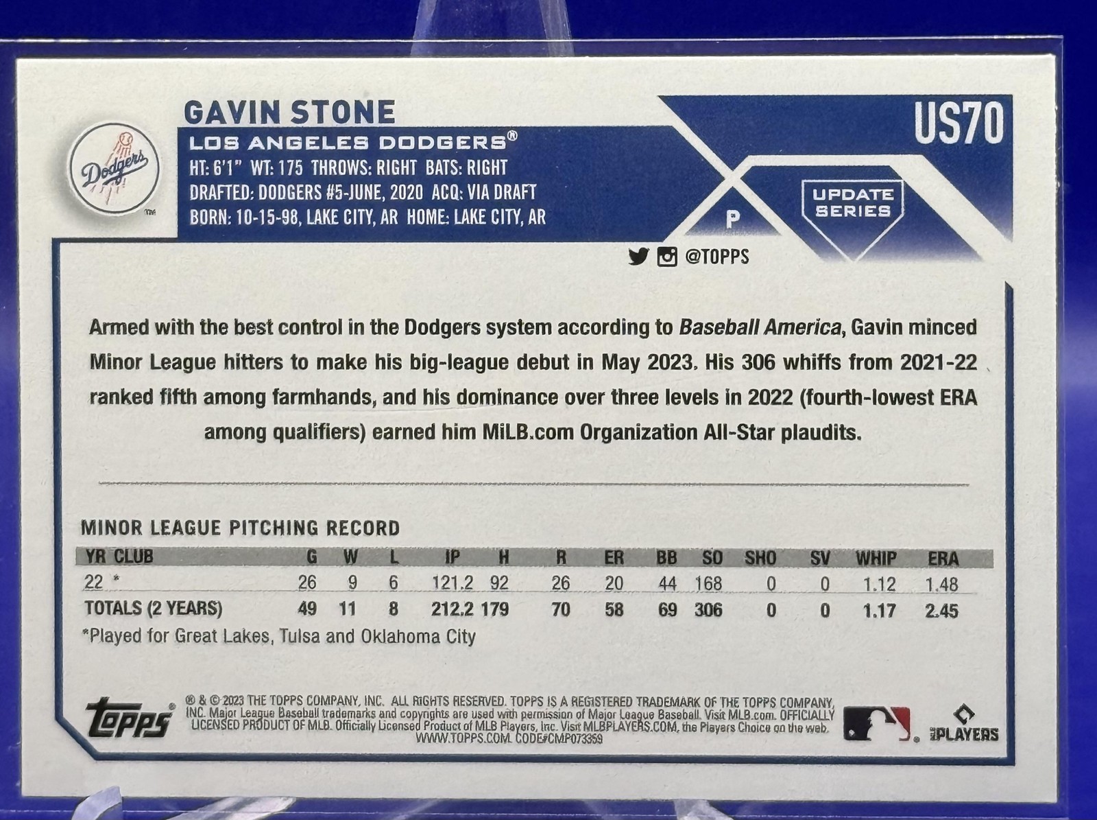 The Card pictured is the card you will receive unless there are multiple quantities then you will receive a card in the comparable grade. Cards in poor condition could have creasing, stains, rounded corners, pen marks or a combo of them. please see pics for a better understanding of cards condition. Excellent Los Angeles Dodgers Orange and Black Foil Gavin Stone #US70 2023 Topps Update Topps 2023 Baseball .