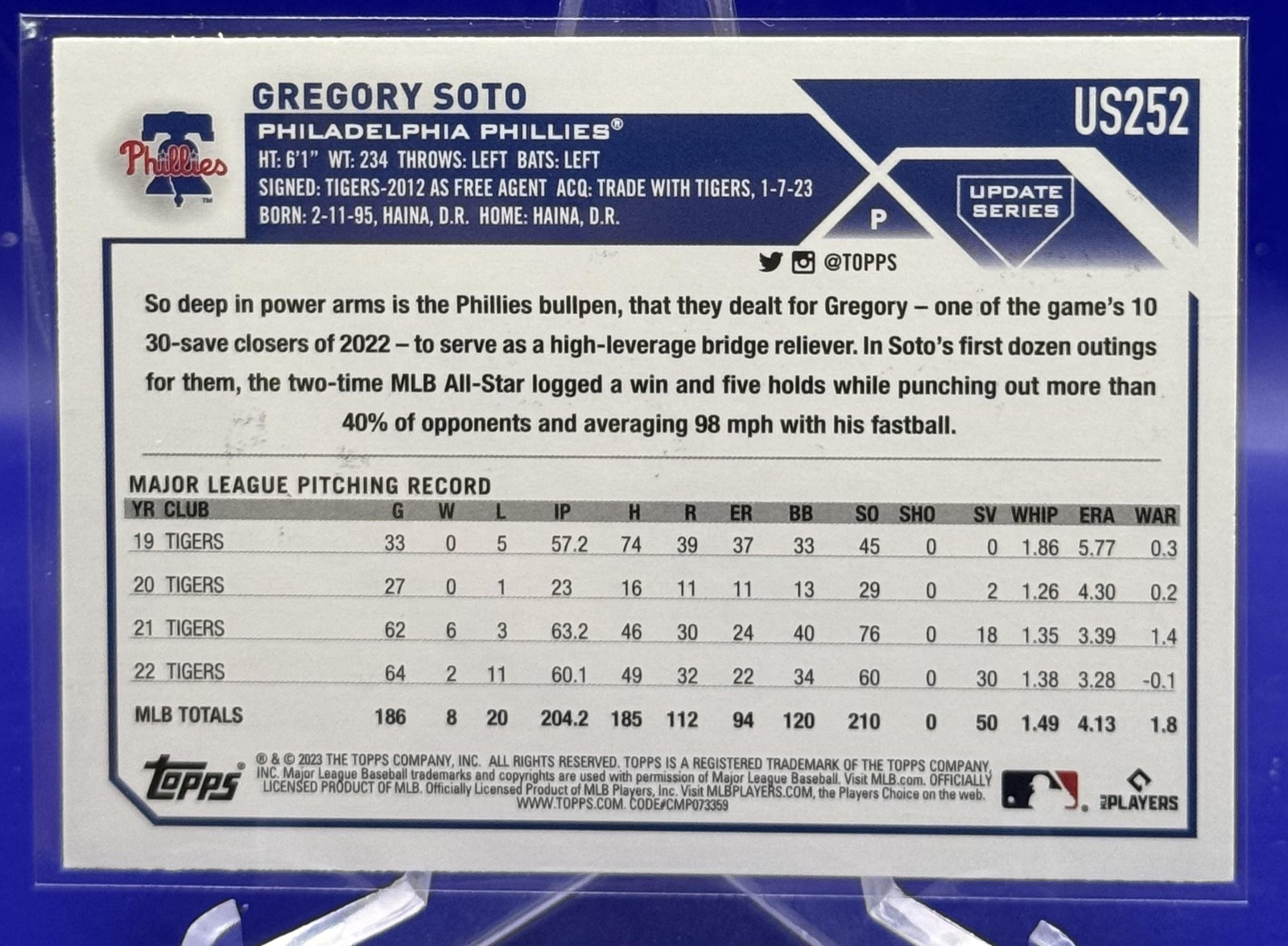 The Card pictured is the card you will receive unless there are multiple quantities then you will receive a card in the comparable grade. Cards in poor condition could have creasing, stains, rounded corners, pen marks or a combo of them. please see pics for a better understanding of cards condition. Excellent Phillies Orange and Black Foil Gregory Soto #US252 2023 Topps Update Topps 2023 Baseball .