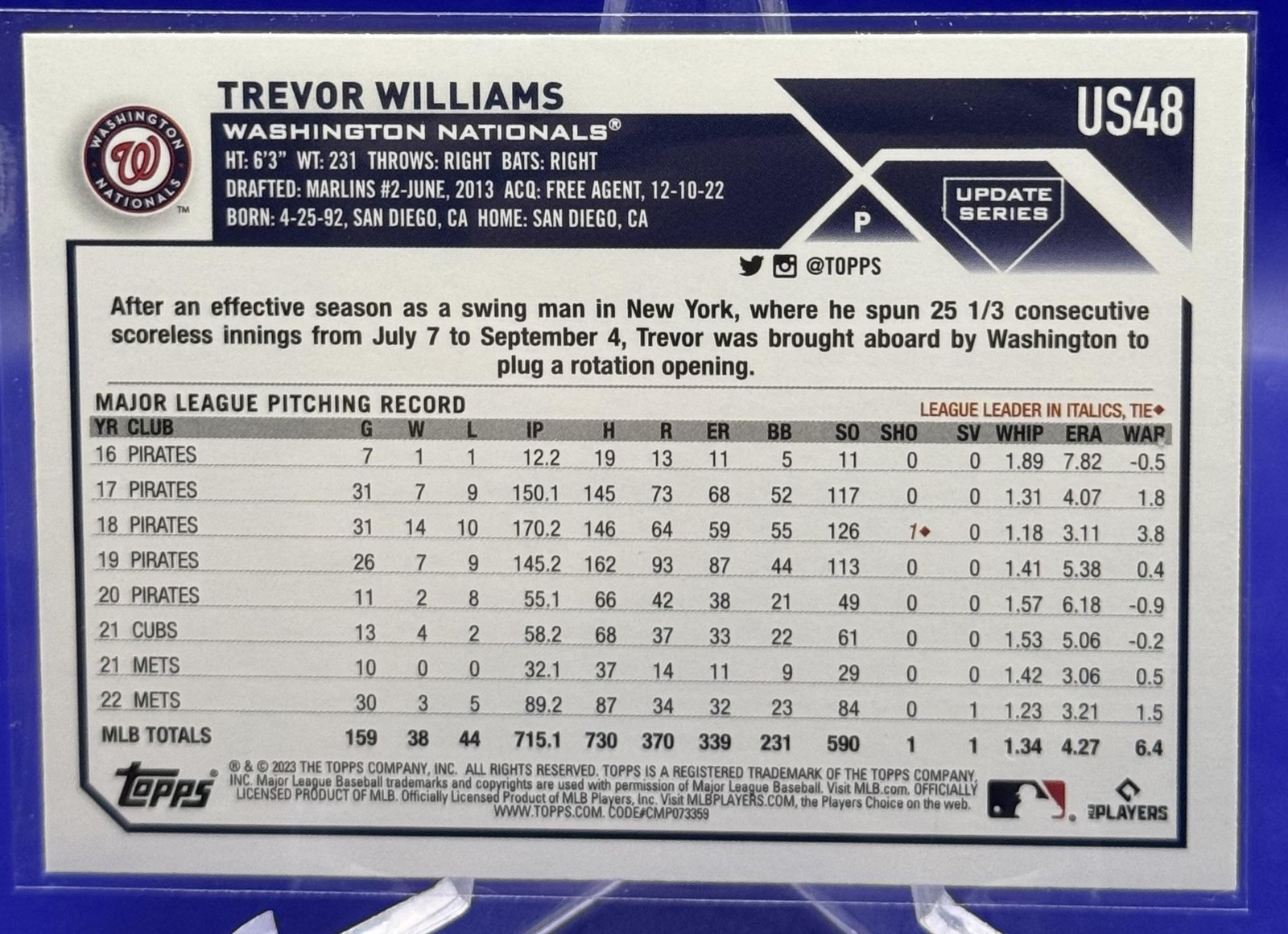 The Card pictured is the card you will receive unless there are multiple quantities then you will receive a card in the comparable grade. Cards in poor condition could have creasing, stains, rounded corners, pen marks or a combo of them. please see pics for a better understanding of cards condition. Excellent Nationals Orange and Black Foil Trevor Williams #US48 2023 Topps Update Topps 2023 Baseball .