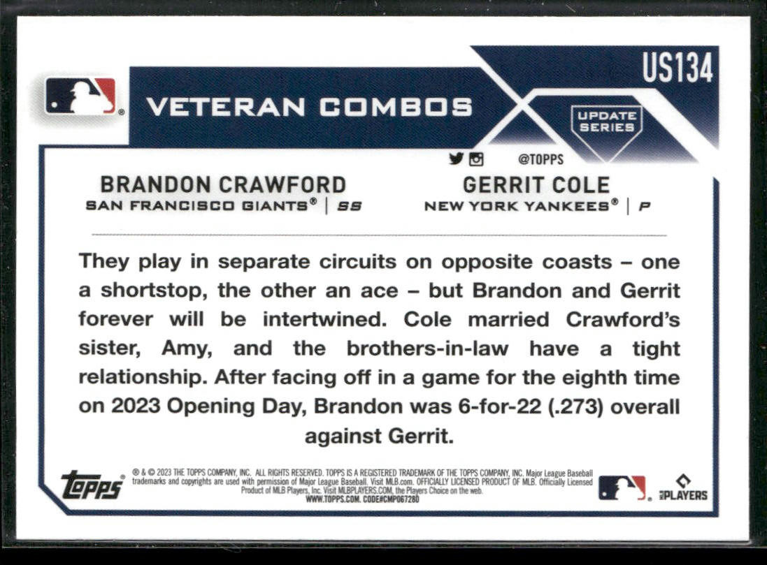 ⚾ Baseball Card featuring 2023 Topps Update #US134 Family Business (Brandon Crawford / Gerrit Cole) VC - . ⚾ 🔥 Product Details: Set: 2023 Topps Update Player: Family Business (Brandon Crawford / Gerrit Cole) VC Card Number: #US134 Team: 🌟 Key Features: Authentic baseball base card from the 2023 Topps Update series. Dynamic image capturing Family Business (Brandon Crawford / Gerrit Cole) VC in action for . Essential for any baseball card collection. 💡 Why You'll Love It: Celebrate your favorite player and team. A foundational piece for baseball card enthusiasts. Quality craftsmanship and officially licensed. 👉 Explore my other Buy Now listings for more baseball base cards and collectibles! Please note that this advertisement is tailored for platforms such as eBay and is aimed at showcasing the key aspects of the sports card. The images included are of the actual card in question. We encourage you to closely examine these images for a detailed overview, including any blemishes or imperfections on the card. Your careful inspection will ensure a thorough understanding of the card's condition.