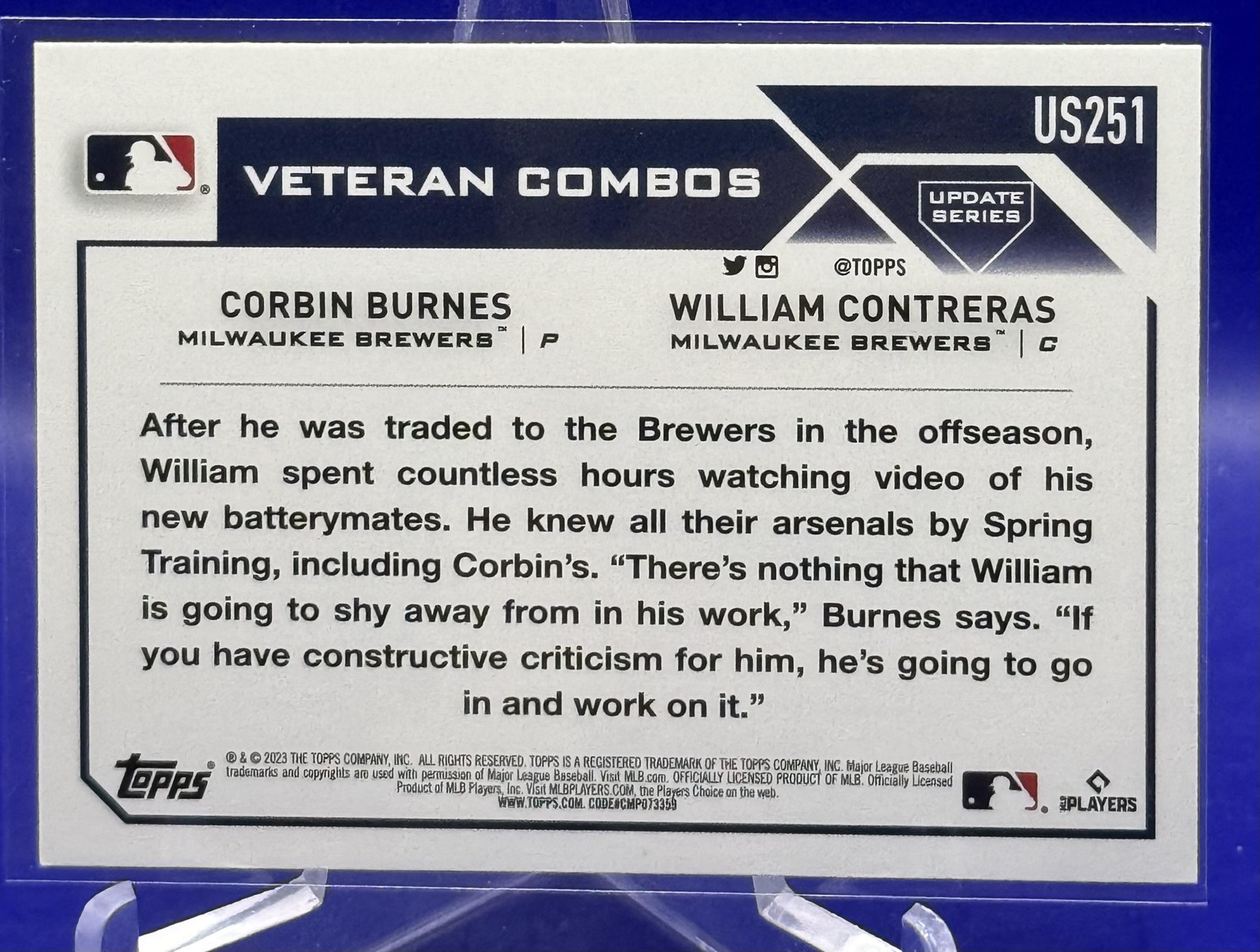 The Card pictured is the card you will receive unless there are multiple quantities then you will receive a card in the comparable grade. Cards in poor condition could have creasing, stains, rounded corners, pen marks or a combo of them. please see pics for a better understanding of cards condition. Excellent Milwaukee Brewers Orange and Black Foil New Battery (William Contreras / Corbin Burnes) #US251 2023 Topps Update Topps 2023 Baseball .