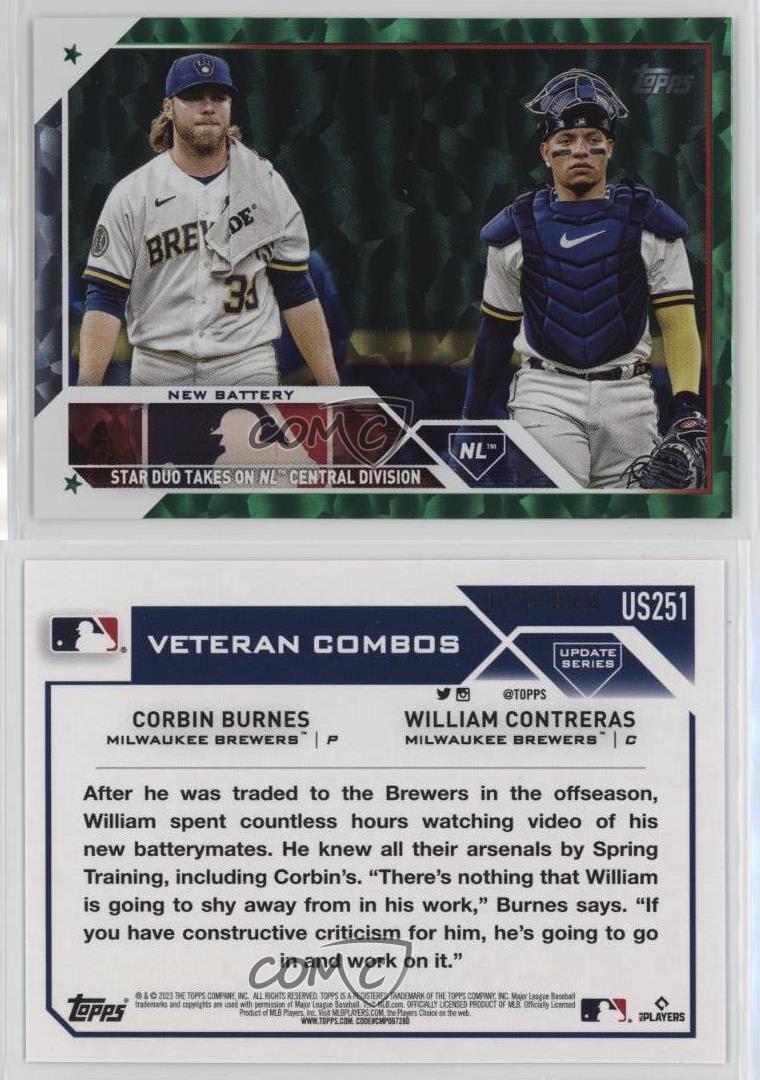 2023 Topps Update Series - [Base] - Green Foil #US251 Veteran Combos - New Battery (Star Duo Takes on NL Central Division) Qty Made: 499 - Baseball Card - Featuring the Milwaukee Brewers - Featuring William Contreras and Corbin Burnes Search for more: 2023 Topps Update Series Search for more: 2023 Topps Update Series - [Base] - Green Foil View all of our Listings Auctions Buy It Now About Us Located in the beautiful Pacific Northwest, COMC (Check Out My Cards) is the world's largest consignment service for trading card singles. More than 10,000 people have used our consignment service to list over 50 million trading cards. Find out how we can help you consign your items on eBay by contacting us through eBay messaging. COMC -- "The Safe & Easy Way to Buy & Sell" Representative Image - Select Specific Item above to see image of actual item Representative Image - Select Specific Item above to see image of actual item Raw Condition for Modern Cards Unless otherwise noted, raw modern cards are listed in Near Mint-Mint condition or better. A NM-MT card appears to be Mint at first glance, but upon closer inspection, may exhibit some of the following: minor print defects (e.g. roller marks, print line, dimple), minor scratches, slight edge wear, and slight corner wear. Centering is clearly visible in the images provided and does not factor into our condition assessment. Raw Condition for Vintage Cards Unless otherwise noted, raw vintage cards are listed in Excellent condition or better. An EX card may exhibit some of the following: minor rounding of corners, surface wear, print defects, light scratches, and slight edge wear/chipping. Centering is clearly visible in the images provided and does not factor into our condition assessment. Domestic Shipping Combined shipping for multiple items is available. To receive combined shipping, please ensure all desired items are in your eBay shopping cart before proceeding to checkout. eBay limits orders to 40 items per order. We automatically combine multiple orders placed on the same day. If you place multiple orders on the same day, please contact us to request a refund of applicable shipping costs. Signature confirmation may be required on invoices over $400. All cards are protected and shipped securely. International Shipping COMC offers eBay's International Shipping (EIS) for international orders under $2,500* (see country exceptions below). All duties and import fees are paid at checkout; in the rare event that there are additional import fees upon delivery, these are borne by the buyer. EIS packages route through a shipping hub in Erlanger, KY before shipping to their final destination. Please note that EIS does not allow for combined shipments. The shipping rates are determined by eBay and cannot be adjusted. *Maximum sale price exceptions: Colombia, Kuwait ($2,000); Taiwan ($1,539); Chile, Costa Rica, Guatemala, Honduras, Trinidad and Tobago ($1,000); Antigua and Barbuda, Aruba, Belize, Dominica, Grenada, Philippines, Saint Kitts and Nevis, Saint Lucia, Montserrat, Turks and Caicos Islands ($500); Dominican Republic, El Salvador ($200). Please request a shipping quote through eBay messaging for orders that exceed the maximum sale price supported by eBay's International Shipping. You will be responsible for all duties and import fees for international orders shipped outside the EIS. All cards are protected and shipped securely. Payment COMC does not accept offers on our cards through our eBay storefront. COMC utilizes eBay’s managed payments system. If you are experiencing difficulties making a payment, please contact eBay for assistance. Return Policy Returns are only accepted on the rare occasion the item is not as described. If you are making a return, please initiate the return process through eBay so a mailing label can be provided for you. Prior to listing, our expert team carefully assessed this item to represent it accurately. Please review the description and high-definition images prior to purchasing to ensure this item meets your satisfaction. We welcome you to contact us if you have further questions about this item. Trust and Integrity COMC carefully assesses each item consigned to us to prevent fraudulent items from entering the marketplace. If you believe an item offered on COMC may be fraudulent, please contact us with details so we can investigate the issue. Items we determine are outside our supported items policy may be removed. Last Modified: 5/17/2025 8:02:39 PM PDT