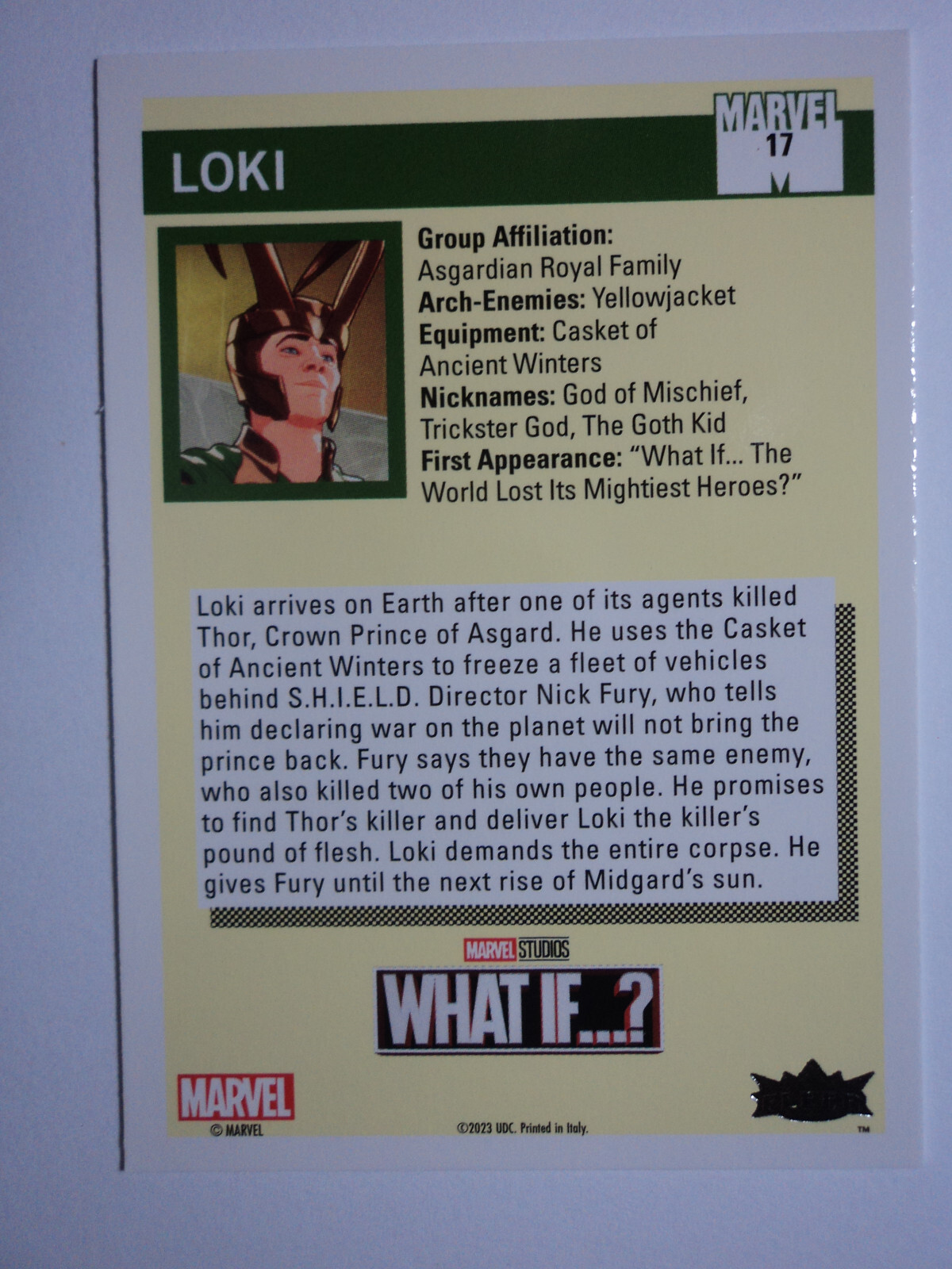 PLEASE DO NOT PAY FOR MULTIPLE PURCHASES SEPARATELY ______________________________________________________________________________________________ Here's what you get: Marvel What If ? - Upper Deck - 2023 CHASE CARD 1990 MARVEL UNIVERSE # 17 LOKI ______________________________________________________________________________________________ Card stored in a smoke-free home. Payment due within 48 hours of purchase. NOTE: IF PURCHASING FROM MORE THEN ONE LISTING, PLEASE DO NOT PAY FOR THEM SEPARATELY, RATHER REQUEST AN INVOICE FROM ME, OR AWAIT RECEIPT OF AN INVOICE FROM ME BEFORE PAYING. When possible, I will combine shipping and handling. A tracking number will be provided on all First Class and Priority packages. You must have a confirmed eBay mailing address. My goal is to provide excellent service to buyers, so I may earn your business over and over. Any questions, please feel free to e-mail me. Please check out my other listings. Happy Collecting. ______________________________________________________________________________________________