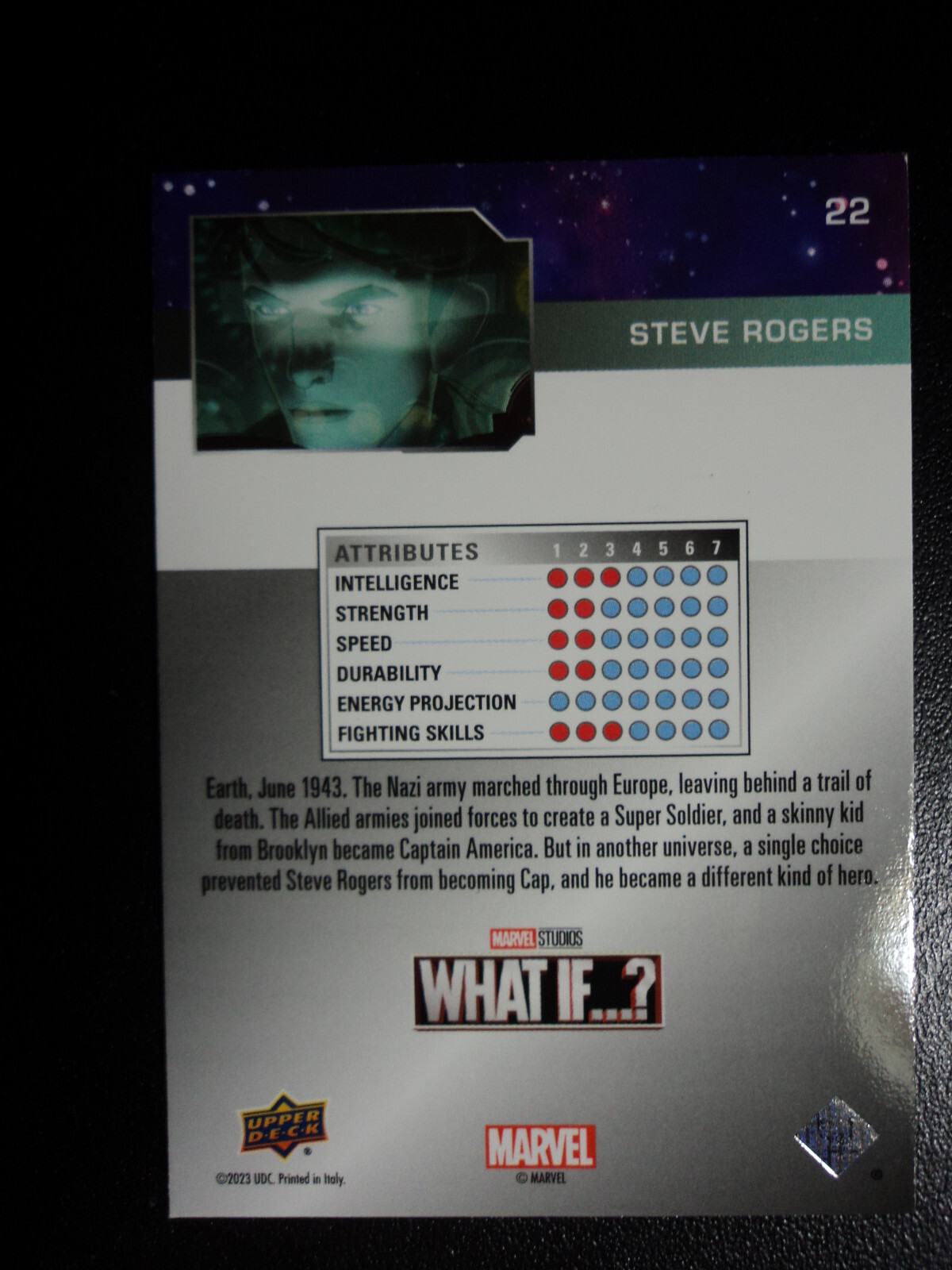 PLEASE DO NOT PAY FOR MULTIPLE PURCHASES SEPARATELY ______________________________________________________________________________________________ Here's what you get: Marvel What If ? - Upper Deck - 2023 BASE CARD # 22 STEVE ROGERS ______________________________________________________________________________________________ Card stored in a smoke-free home. Payment due within 48 hours of purchase. NOTE: IF PURCHASING FROM MORE THEN ONE LISTING, PLEASE DO NOT PAY FOR THEM SEPARATELY, RATHER REQUEST AN INVOICE FROM ME, OR AWAIT RECEIPT OF AN INVOICE FROM ME BEFORE PAYING. When possible, I will combine shipping and handling. A tracking number will be provided on all First Class and Priority packages. You must have a confirmed eBay mailing address. My goal is to provide excellent service to buyers, so I may earn your business over and over. Any questions, please feel free to e-mail me. Please check out my other listings. Happy Collecting. ______________________________________________________________________________________________