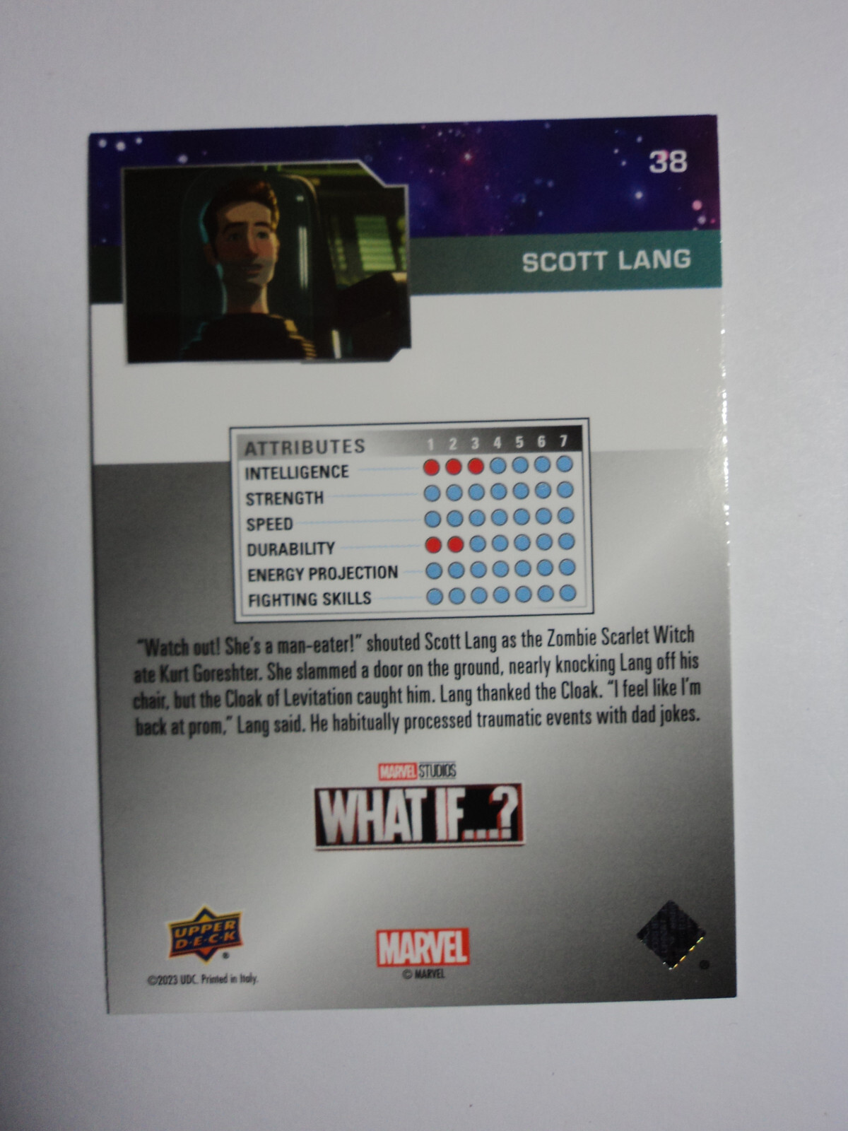 PLEASE DO NOT PAY FOR MULTIPLE PURCHASES SEPARATELY ______________________________________________________________________________________________ Here's what you get: Marvel What If ? - Upper Deck - 2023 BASE CARD # 38 SCOTT LANG ______________________________________________________________________________________________ Card stored in a smoke-free home. Payment due within 48 hours of purchase. NOTE: IF PURCHASING FROM MORE THEN ONE LISTING, PLEASE DO NOT PAY FOR THEM SEPARATELY, RATHER REQUEST AN INVOICE FROM ME, OR AWAIT RECEIPT OF AN INVOICE FROM ME BEFORE PAYING. When possible, I will combine shipping and handling. A tracking number will be provided on all First Class and Priority packages. You must have a confirmed eBay mailing address. My goal is to provide excellent service to buyers, so I may earn your business over and over. Any questions, please feel free to e-mail me. Please check out my other listings. Happy Collecting. ______________________________________________________________________________________________