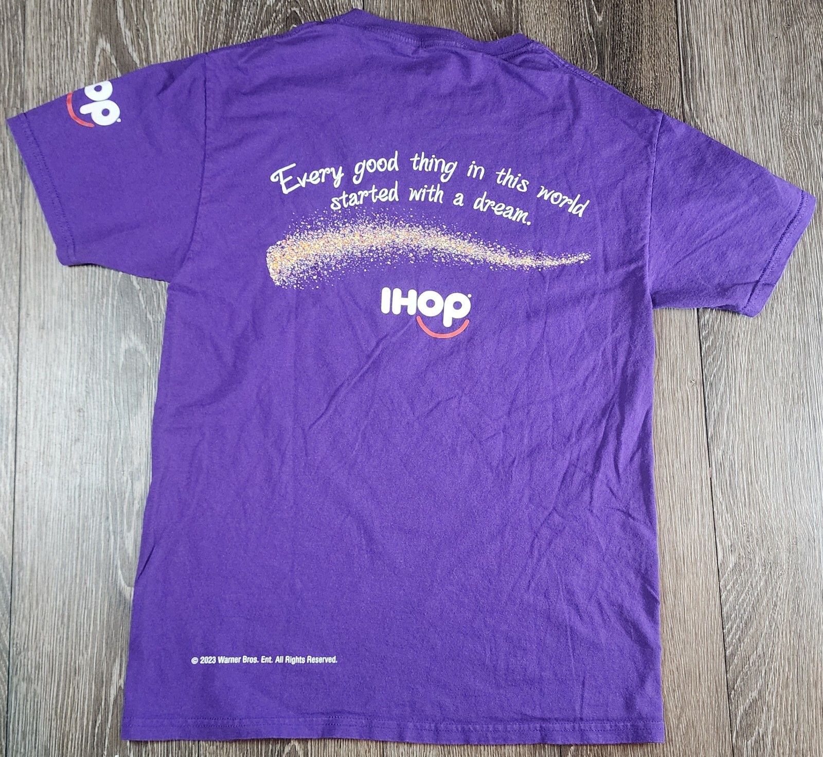 2023 Warner Bros Willy Wonka Movie IHOP Promo T-Shirt Unisex SIZE TAG MISSING. ORIGIN, GARMENT CARE, AND MATERIAL INFORMATION MISSING. PLEASE REVIEW MEASUREMENTS IN PICTURES BEFORE PURCHASING (MEASUREMENTS CORRESPOND TO A SMALL). G