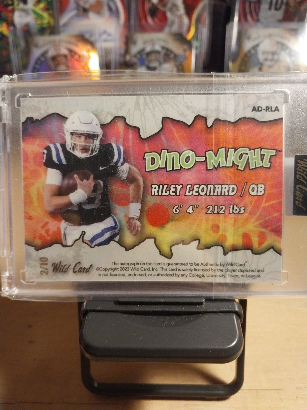 The 2023 Wild Card Alumination Riley Leonard Dino-Might RC Auto /10 is a highly sought-after sports trading card featuring an autograph from Riley Leonard, a rising football star from Notre Dame. Limited to just 10 copies, this collectible piece is part of the Wild Card set for the 2023 season, making it a valuable addition to any fan's memorabilia collection. With features like being serial numbered, a short print, and a rookie insert, this rare card showcases the athletic prowess of Leonard and is a must-have for enthusiasts of the NCAA and college football. 2/10