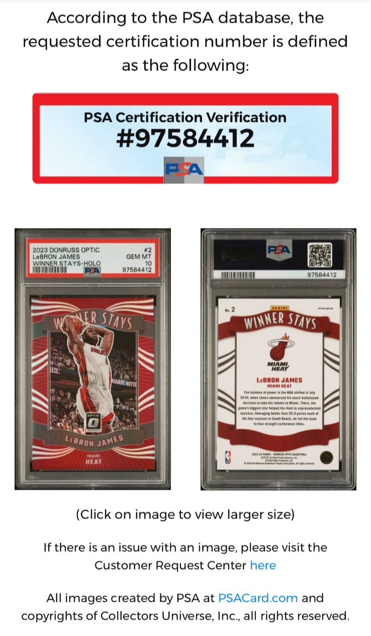 Capture a piece of sports history with the 2023-24 Panini Donruss Optic LeBron James Holo Winner Stays Prizm #2 card. This stunning insert features the legendary Miami Heat player, LeBron James, and is a must-have for any basketball card collector or fan of the sport. The Holo Prizm parallel adds an eye-catching shimmer to the card, making it a standout addition to any collection. The card is part of the renowned 2023-24 Panini Donruss Optic set, known for its quality and collectibility. With this card, you're not just getting a piece of memorabilia, but a tribute to one of the NBA's finest athletes. Whether you're a fan of LeBron, the Miami Heat, or a connoisseur of basketball memorabilia, this card is a worthy addition to any collection.