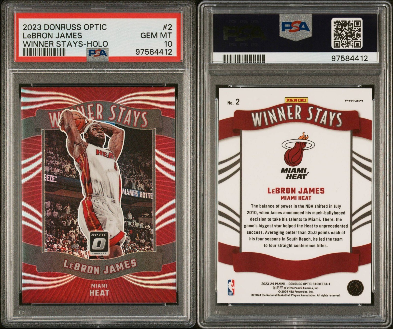 A must-have for LeBron fans! This Holo Prizm card shines with vibrant detail, capturing the King's legacy in Miami. The Winner Stays insert is a brilliant addition to any collection, making it a standout piece for basketball enthusiasts. The sleek Donruss Optic quality adds serious value—definitely a prized find for serious collectors or anyone who appreciates iconic NBA moments. Grab this gem before it’s gone!