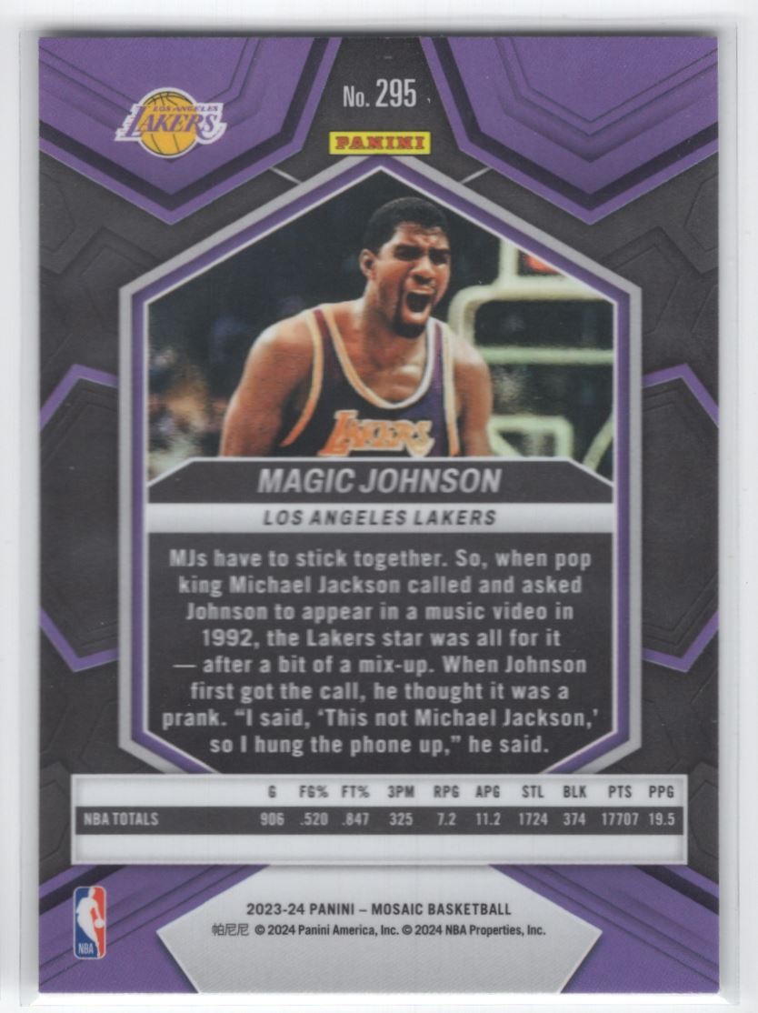 This Magic Johnson card from the 2023-24 Panini Mosaic NBA Greats series is an absolute gem for any Lakers or basketball collector! The vibrant colors and sharp details really make the design pop, perfectly capturing Magic’s legendary court presence. The card feels premium, and the real scan shows its flawless condition. A must-have for fans of the Showtime era—definitely a standout in any collection!